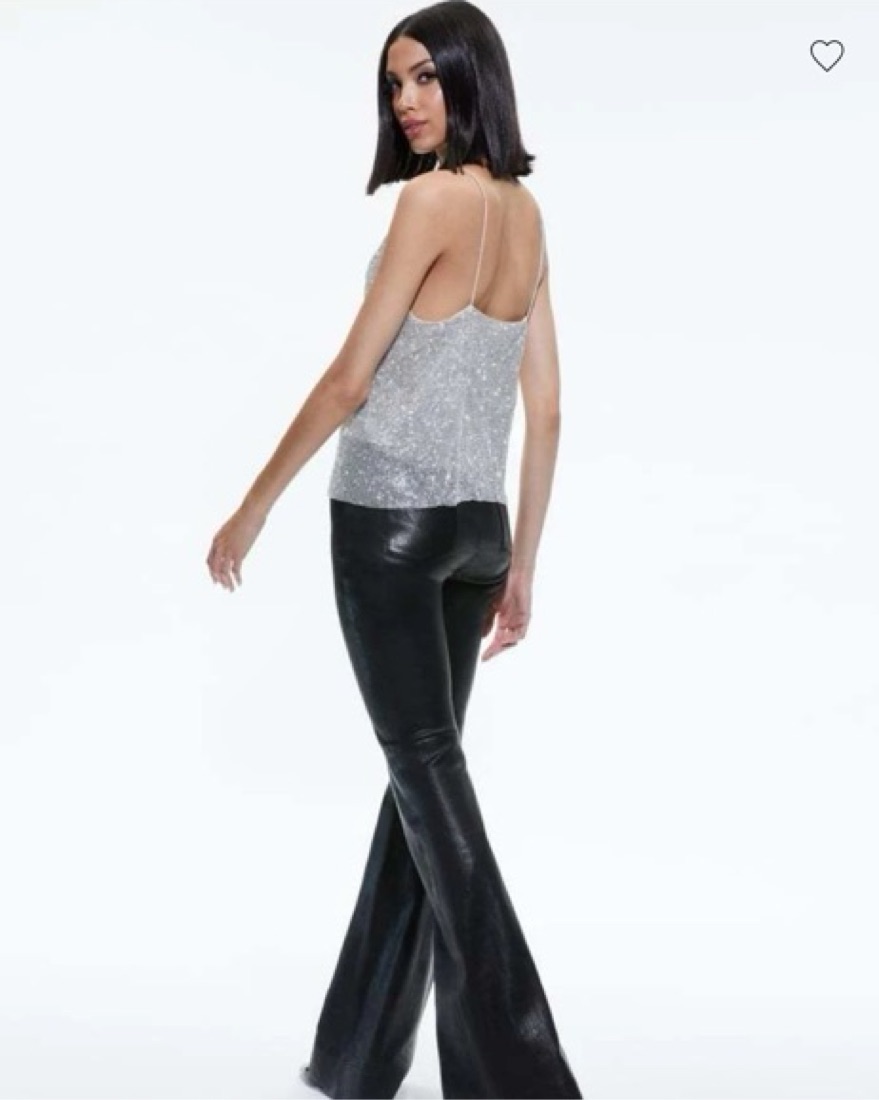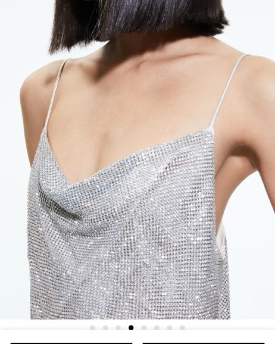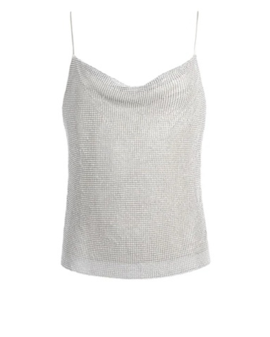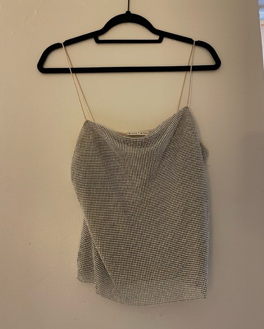 *heavy shirt* 50% aluminum 50% glass, spaghetti strap cowl neck tank with crystal embellishments throughout. Delicate top so will need to price adjust if damaged.