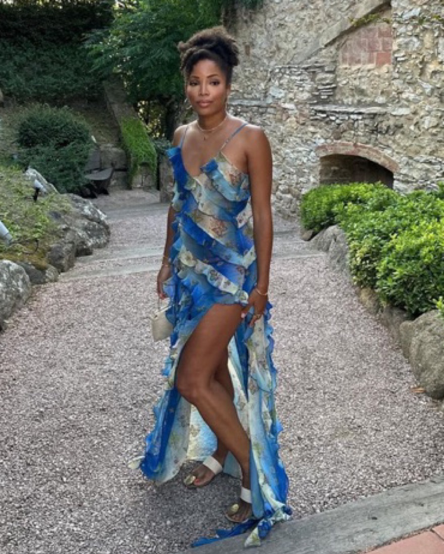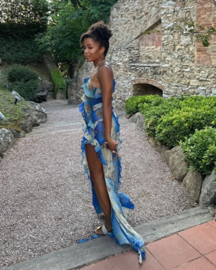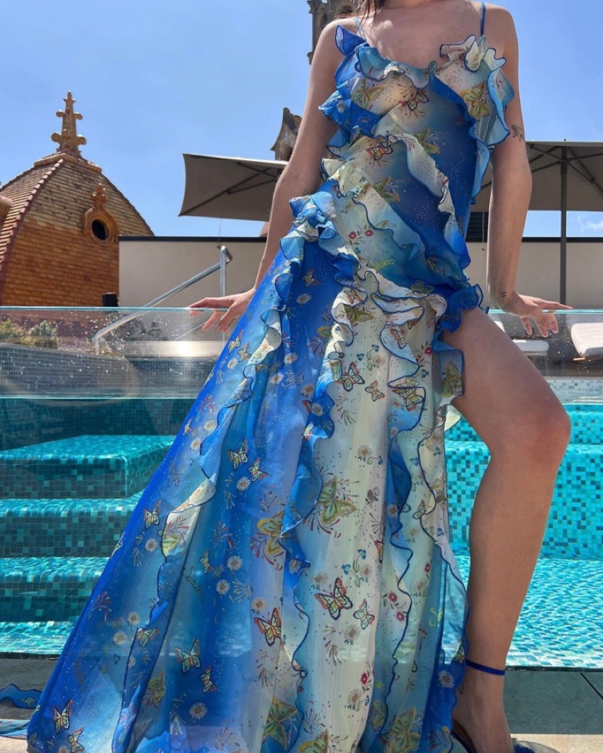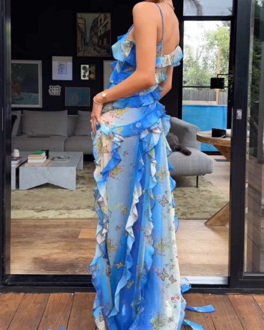 EU 34 = ~US 2, can fit XS/S. Must be very careful with the hem since it’s long. Enveloped in a bespoke floral butterfly print, this Mari dress from SIEDRES evokes the label’s whimsical aesthetic. It’s enlivened with cascading ruffles that fall to a wispy train.