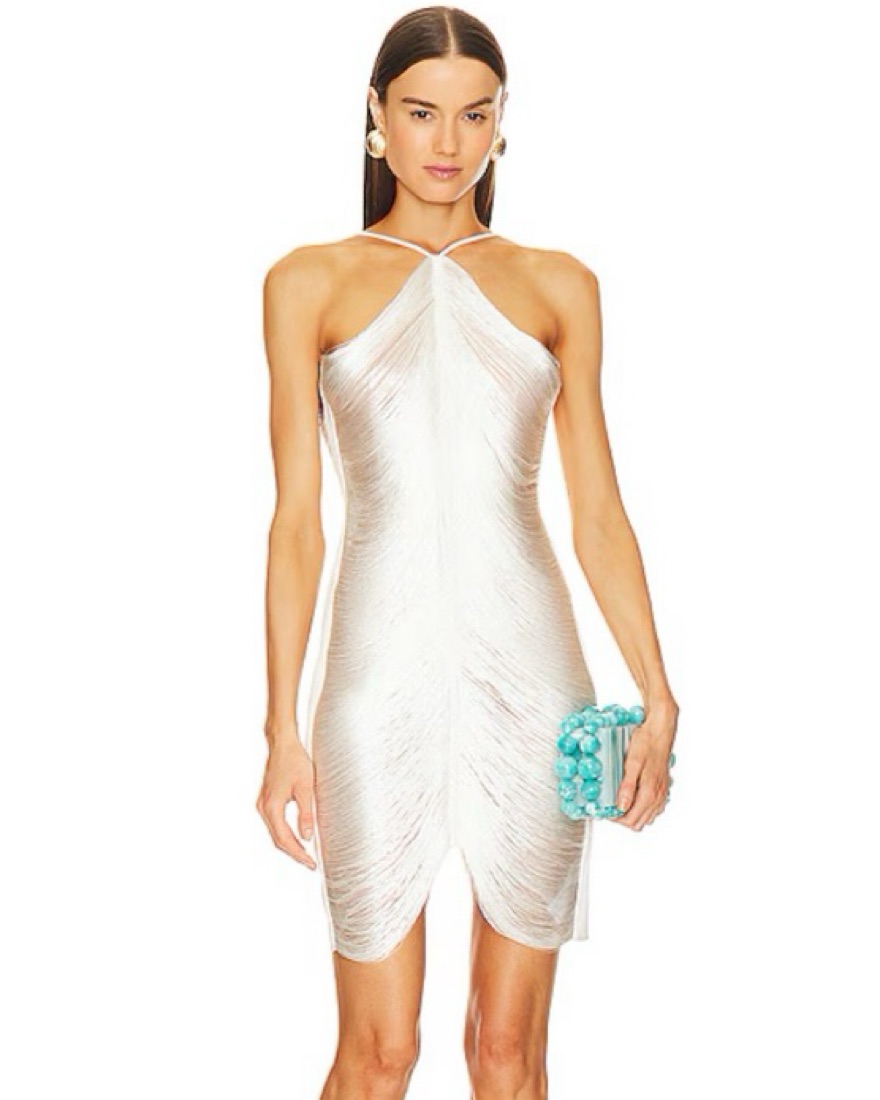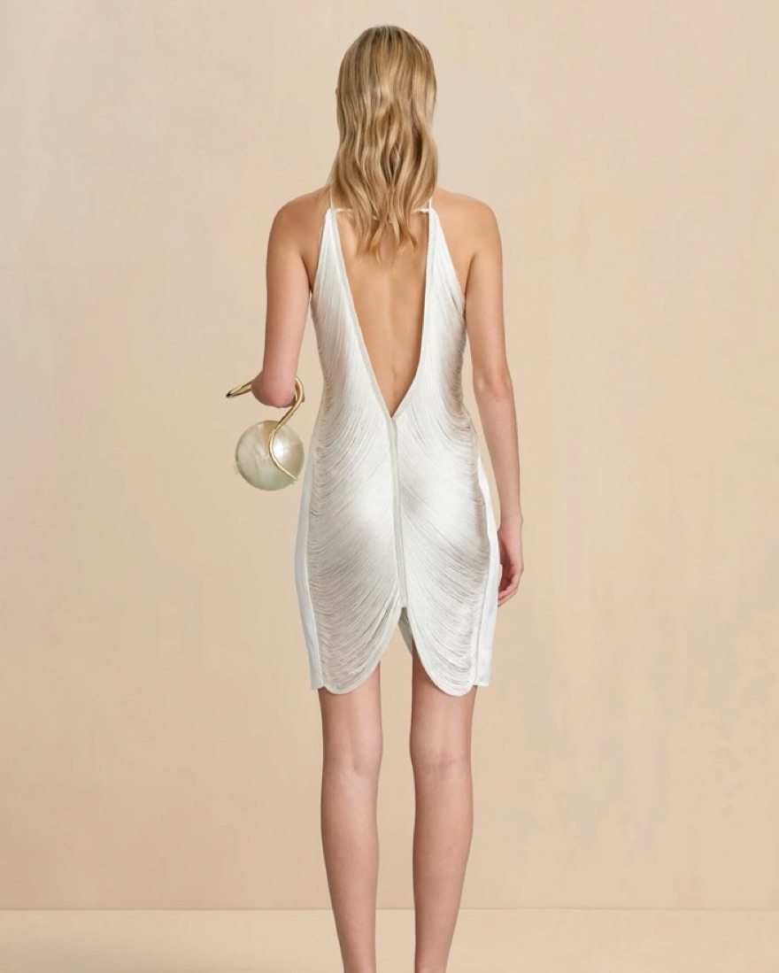 Stunning mini- length draped fringe halter dress with a deep v cut open back. Also known as the “Mara dress” by Cult Gaia.