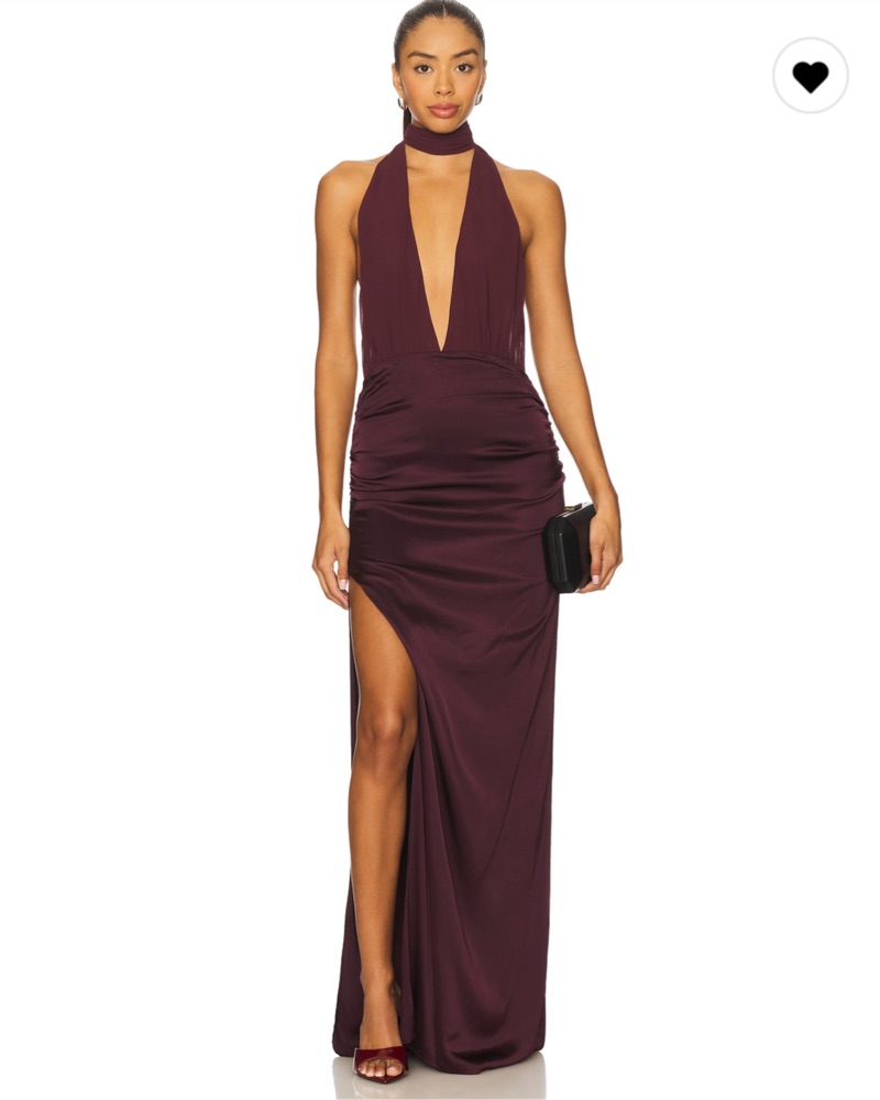 Revolve NBD Roja gown, perfect for weddings! Dark Plum/Maroon color Halterneck styling with tie detail Plunging neckline Lightweight satin fabric