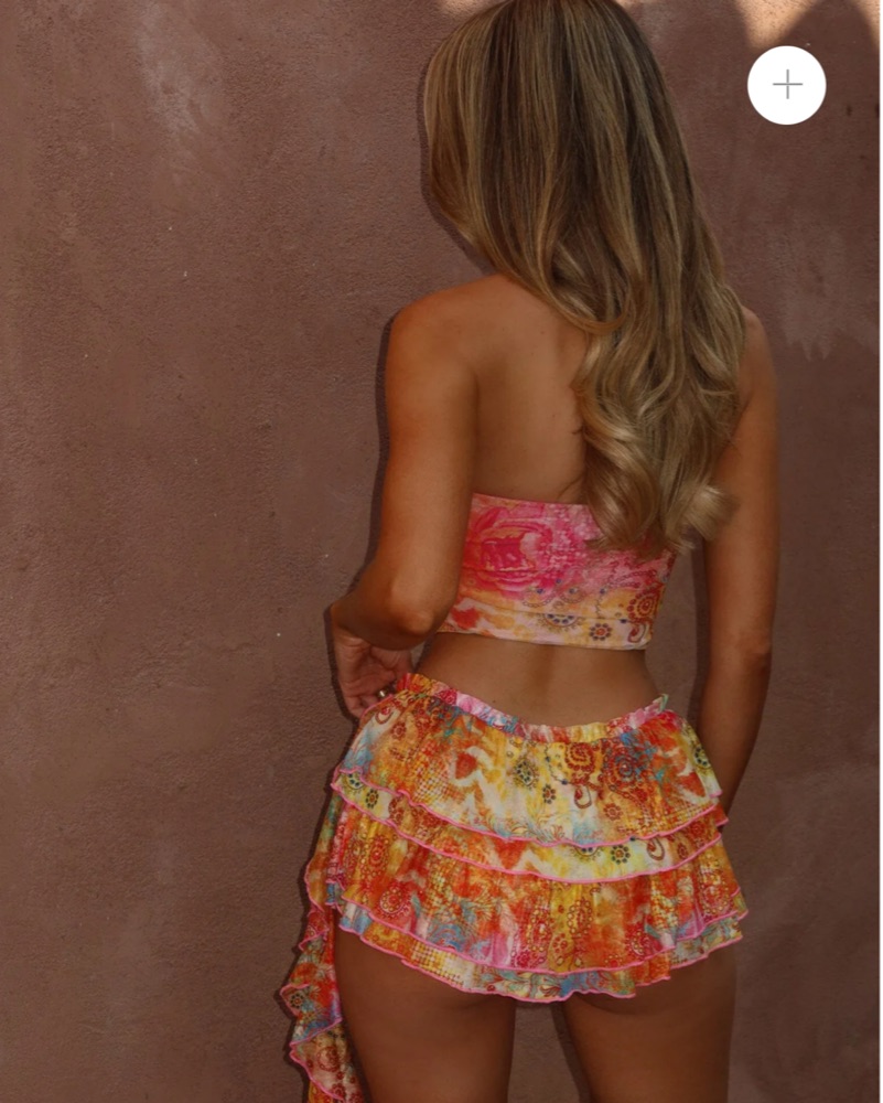 Cut out top and skort set. Colorful print and flirty ruffles create a playful, festival-ready look