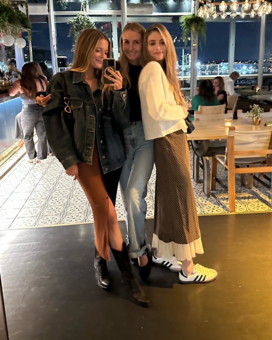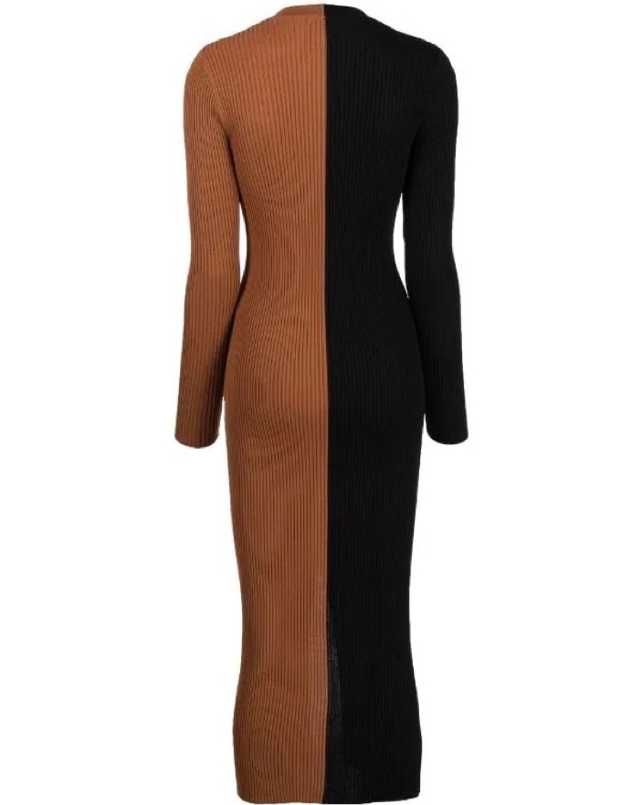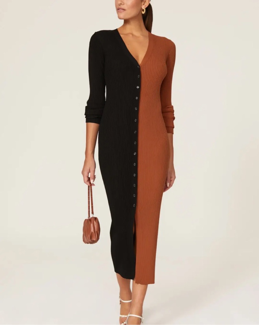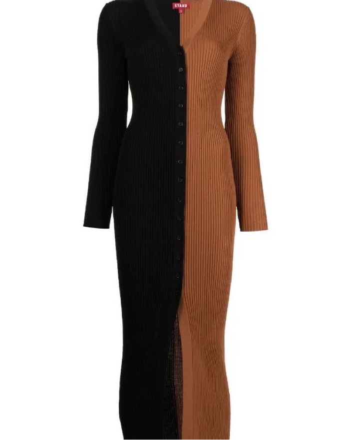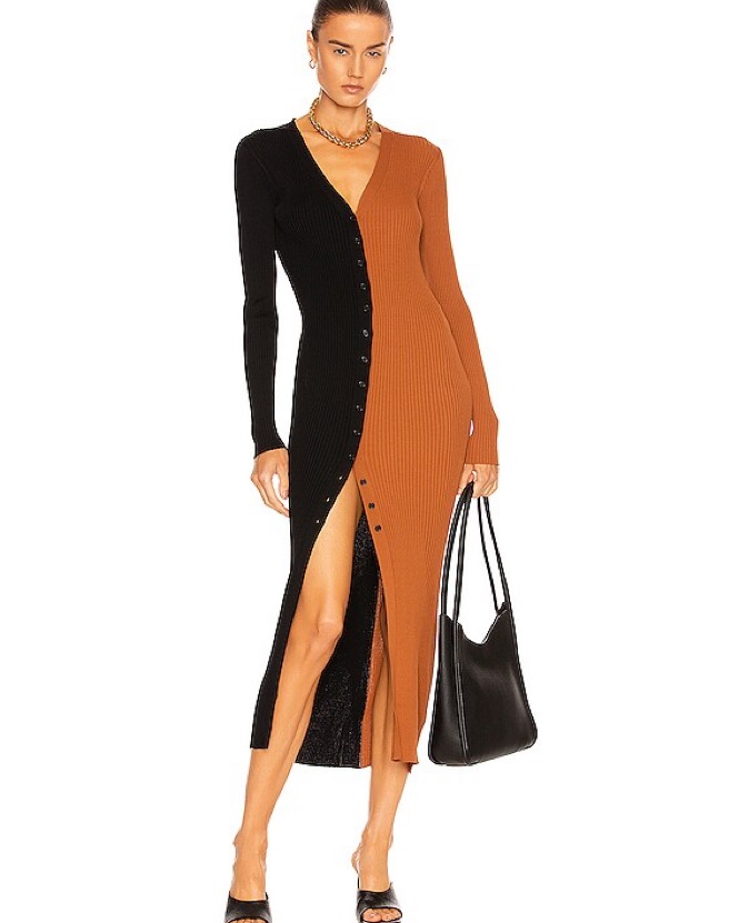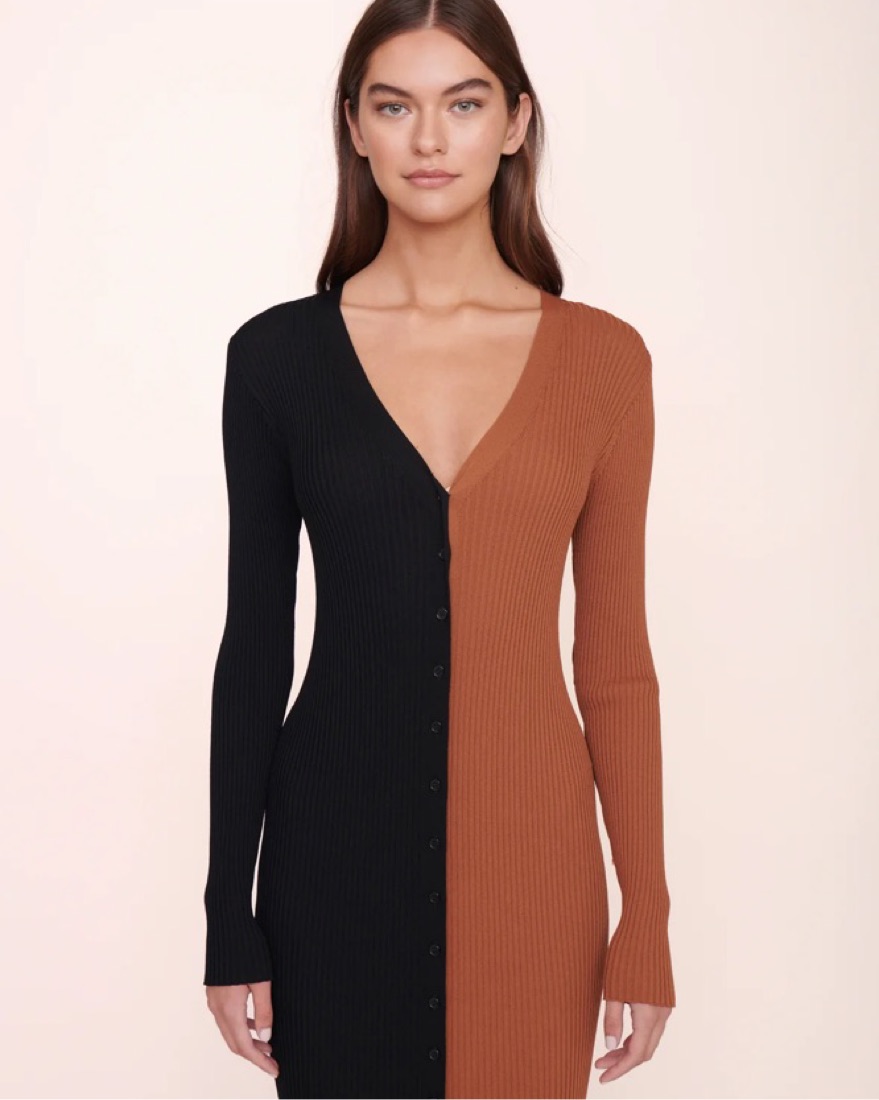 the Shoko Sweater, can be worn as a cardigan or dress. This two-tone style is made out of a stretchy, comfortable compact rib knit fabric