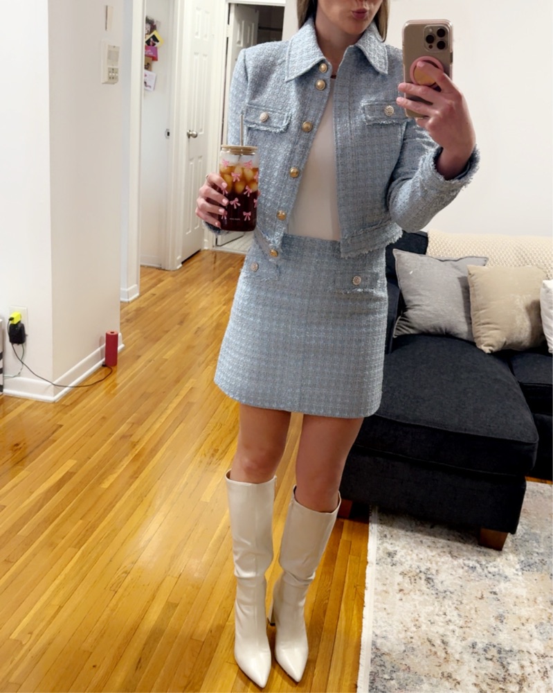 Two piece set blazer and skirt. Tweed, light blue, very comfortable
