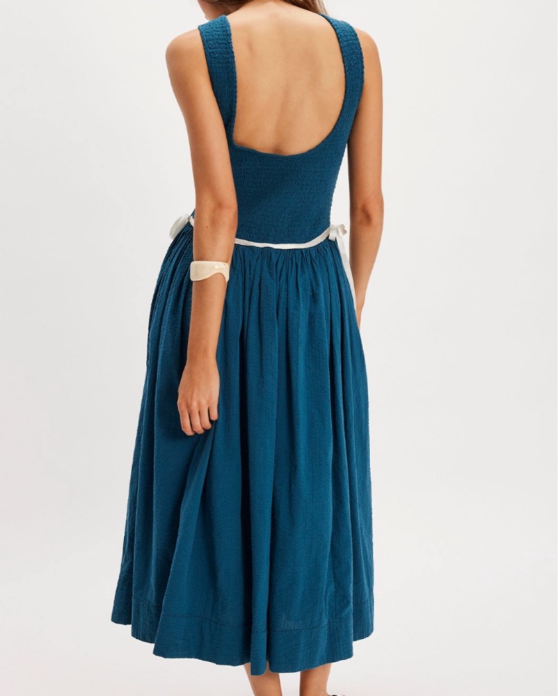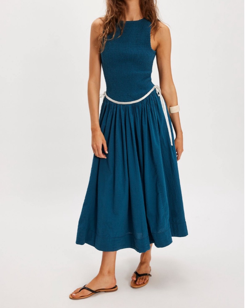 Ruched top drop waist sun dress from free people. If you are shorter the dress will be longer on you than shown in the picture.