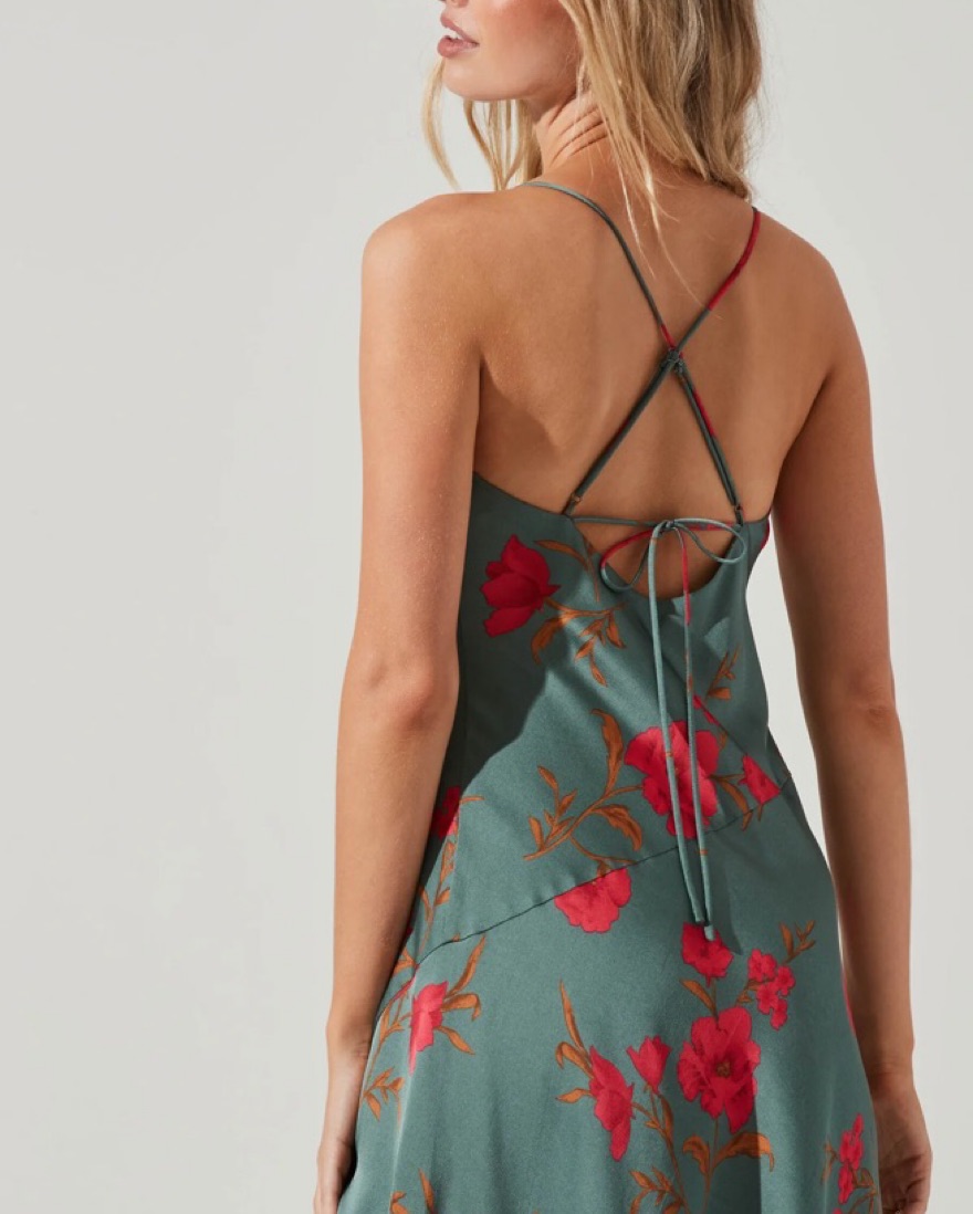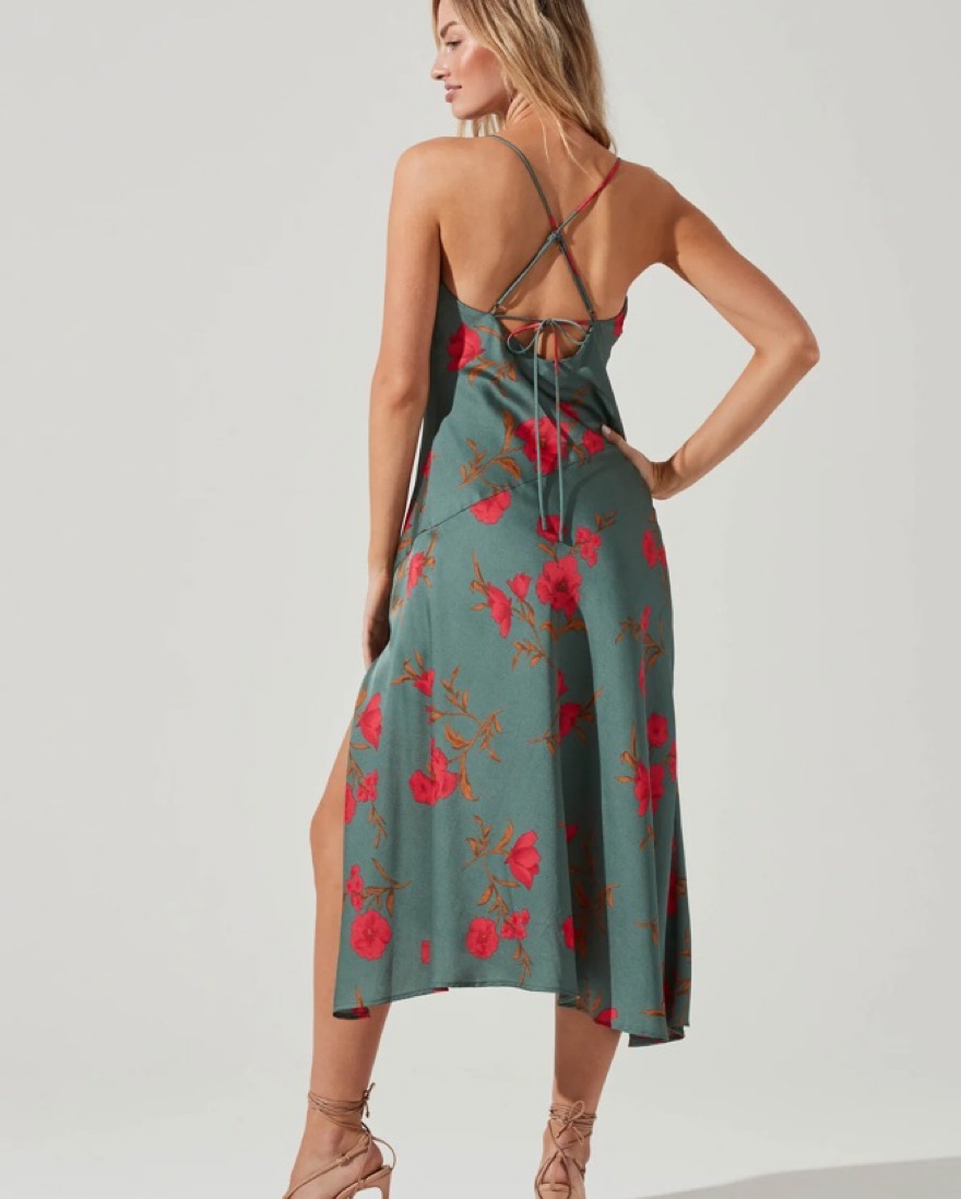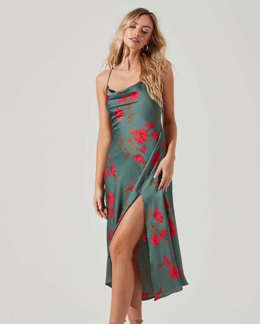 ASTR dress in Teal/Raspberry Floral. Cowl neckline accentuates the bust and is supported by adjustable straps. Fitted bodice descends to a relaxed midi skirt with front slit accent. Low cut back with adjustable cross straps.