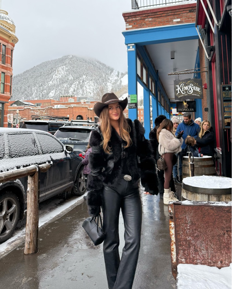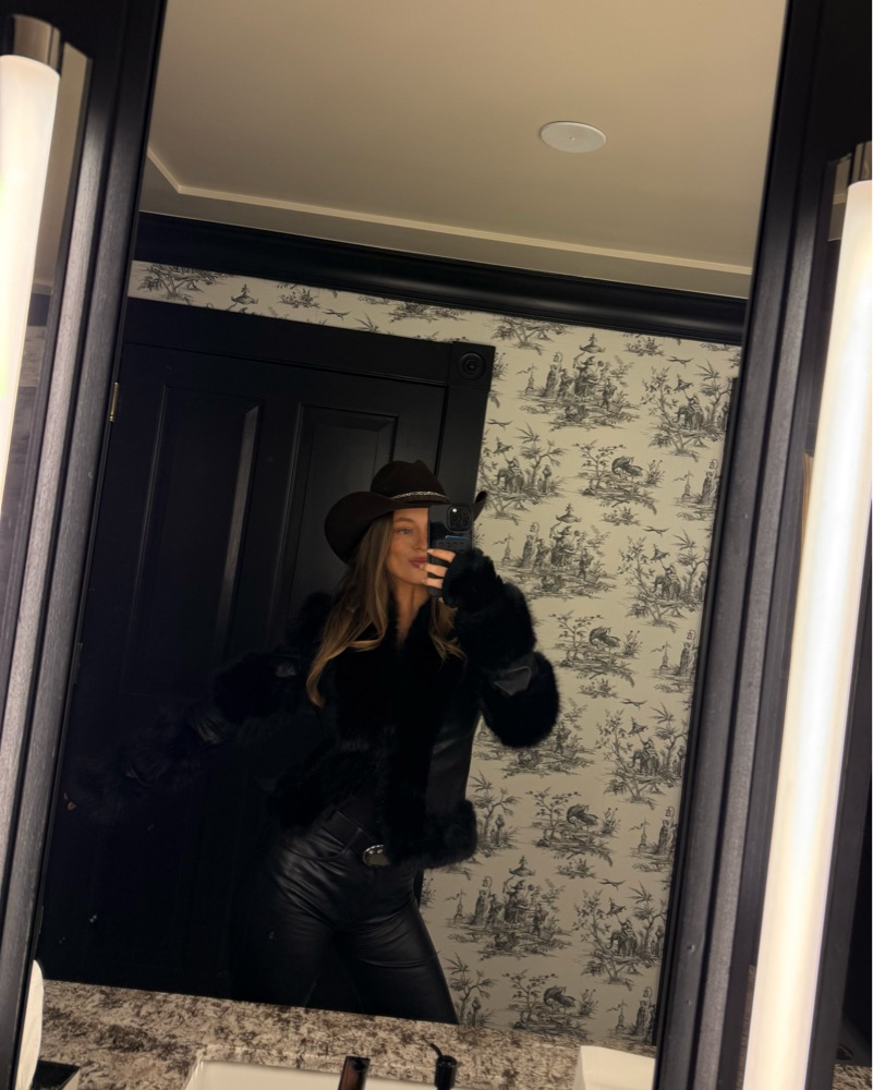 Black I am GIA fur jacket with fur sleeve detail!! So complimented. Has a clip closure at front. It’s a size medium, I’m typically a size 4 for reference