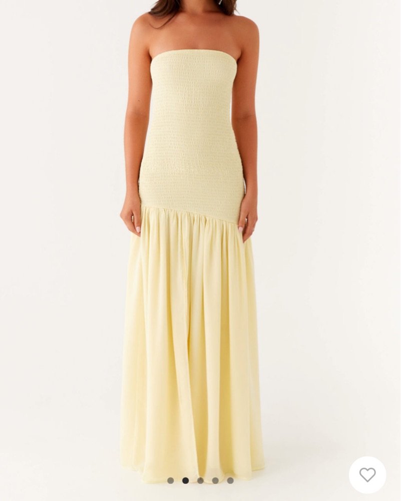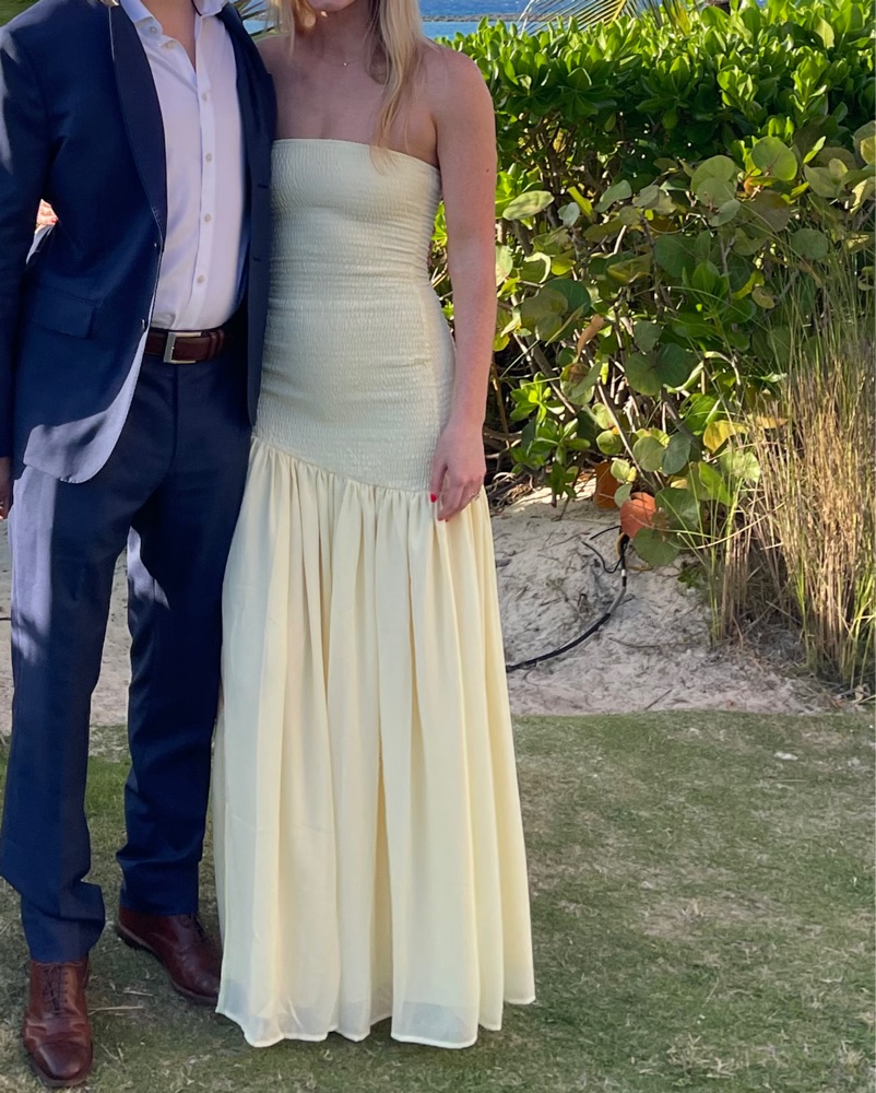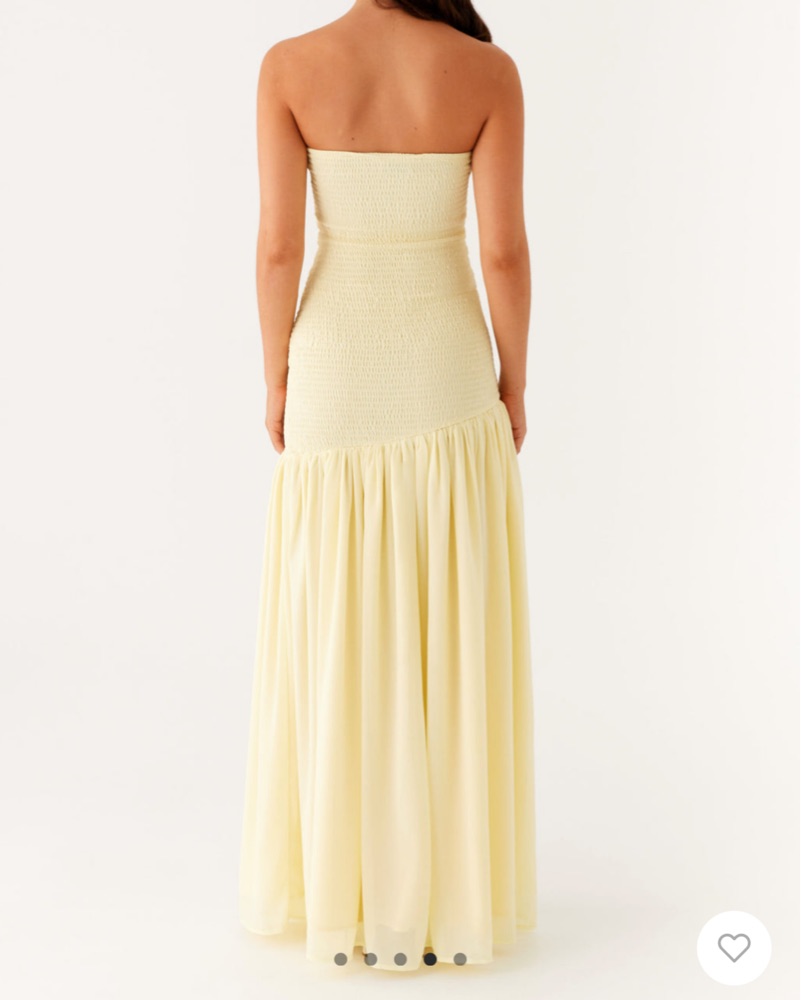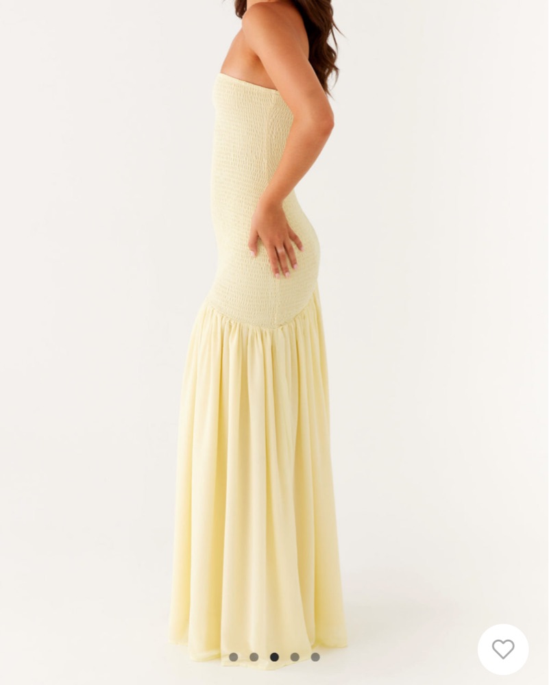 Butter yellow maxi dress, drop waist detail, side slit, smocking all over bodice. 100% poly