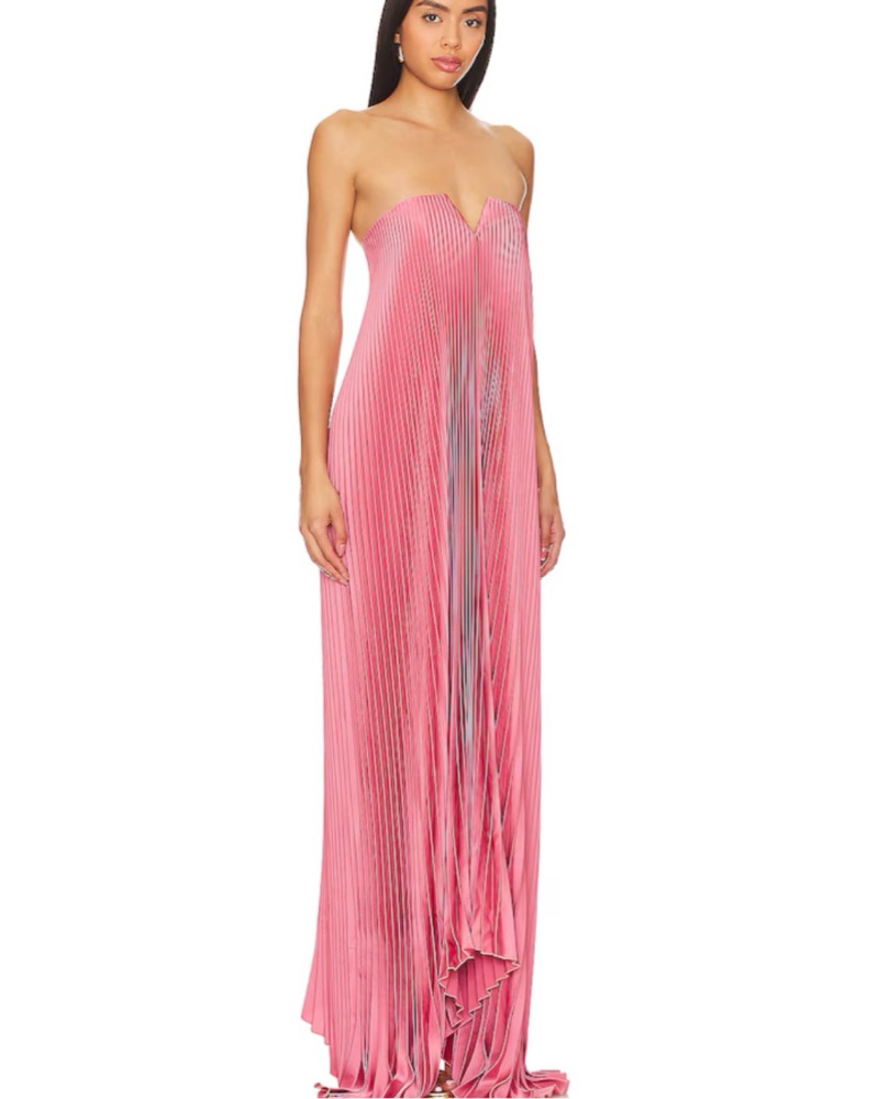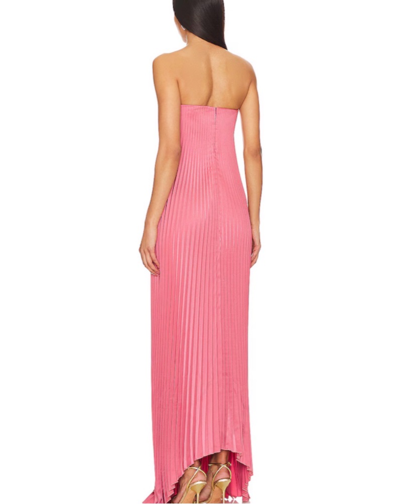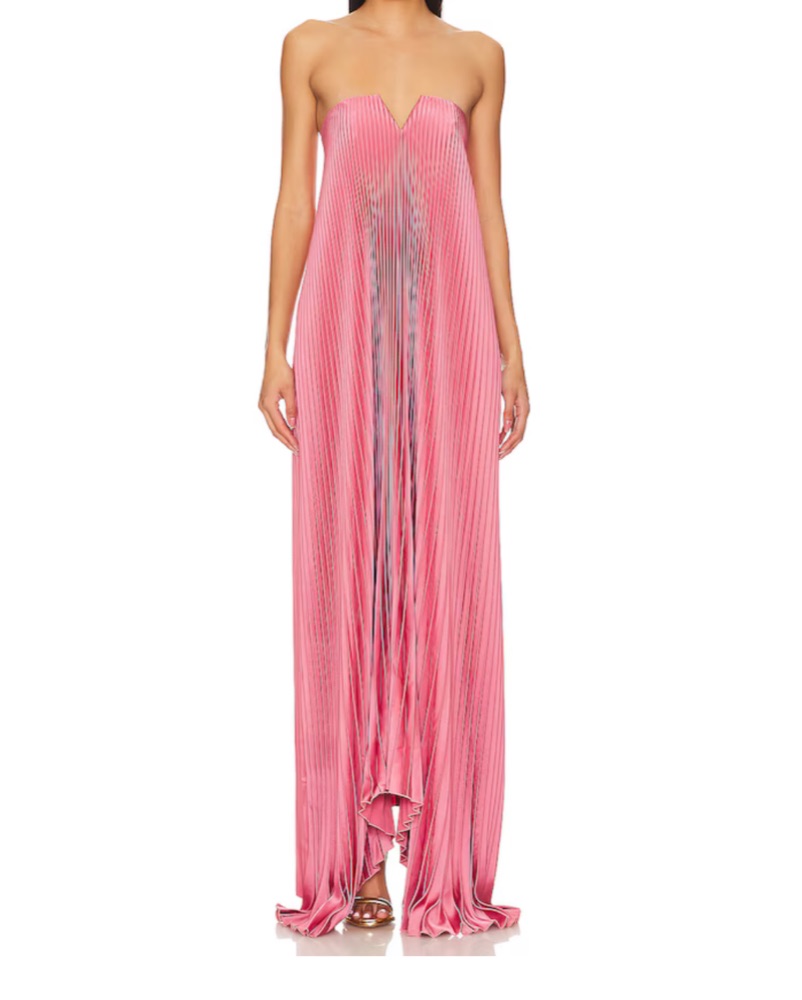 Beautiful comfortable gown in the shade dusty rose. Pleating is gorgeous and moves beautifully.