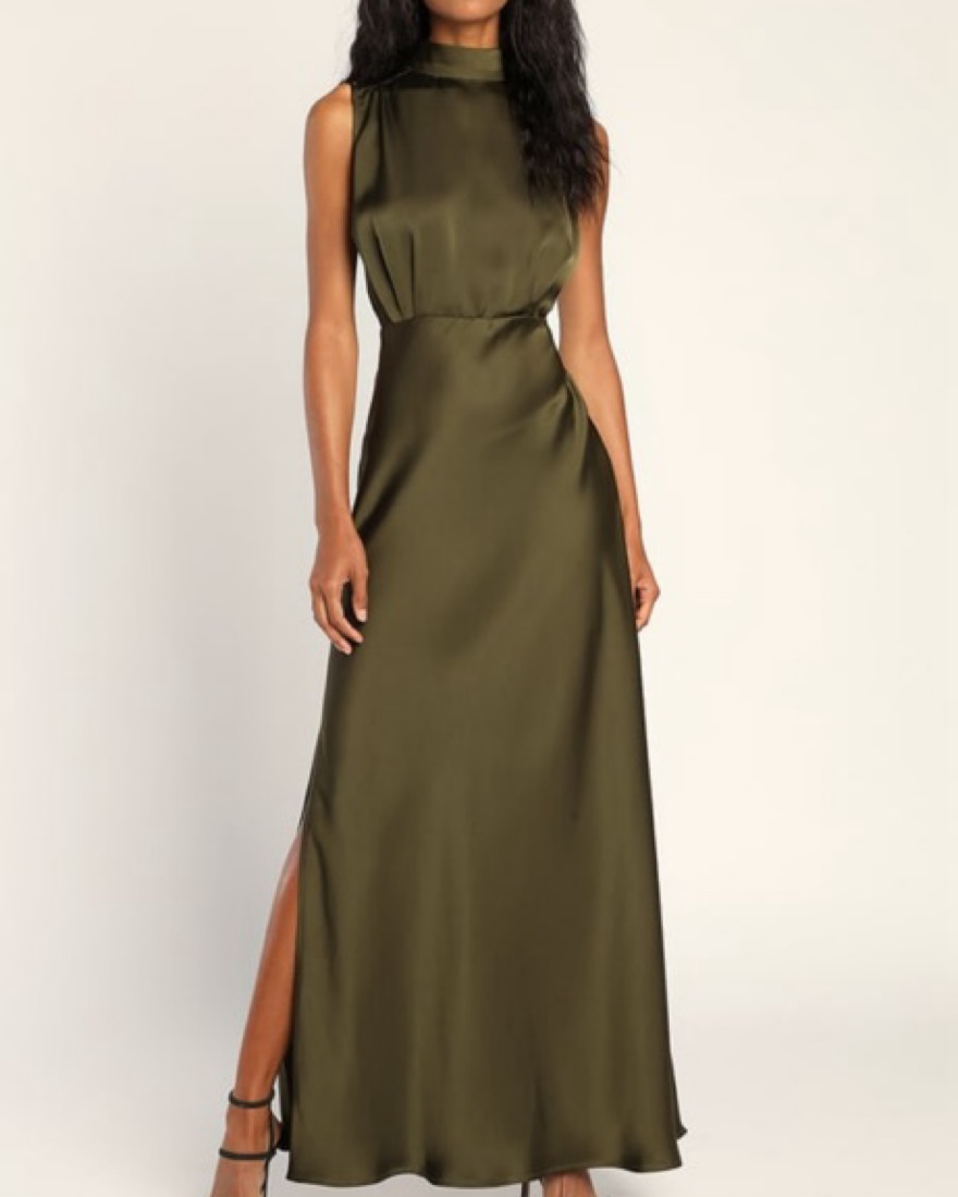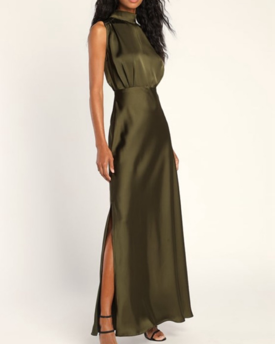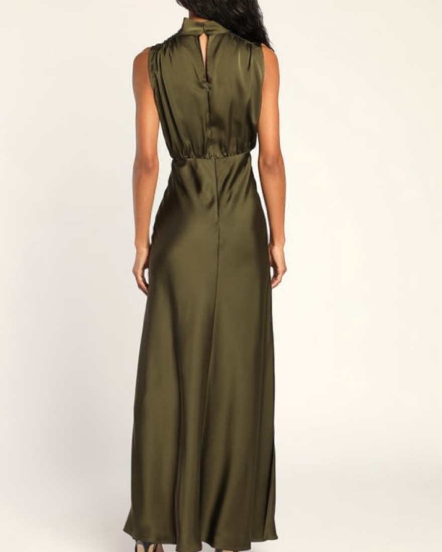 Lulus classic elegance olive satin sleevless mock neck maxi dress - great condition, worn once wnd cleaned