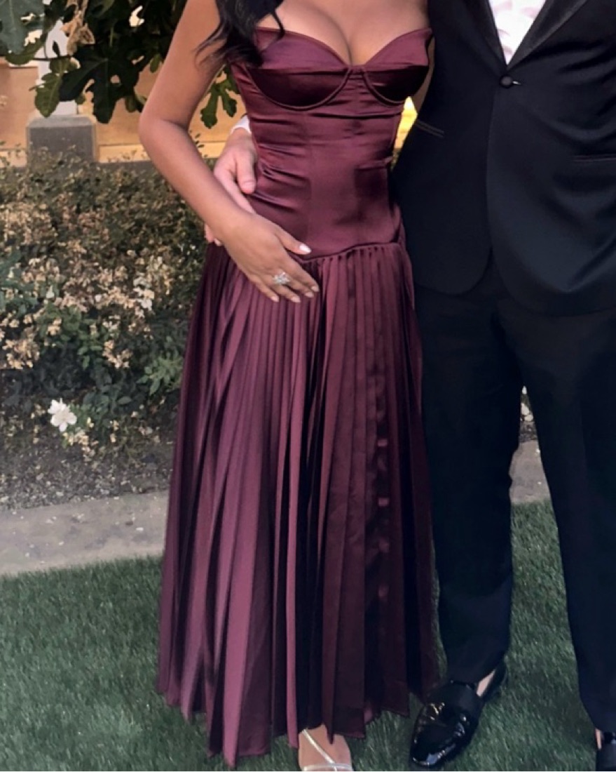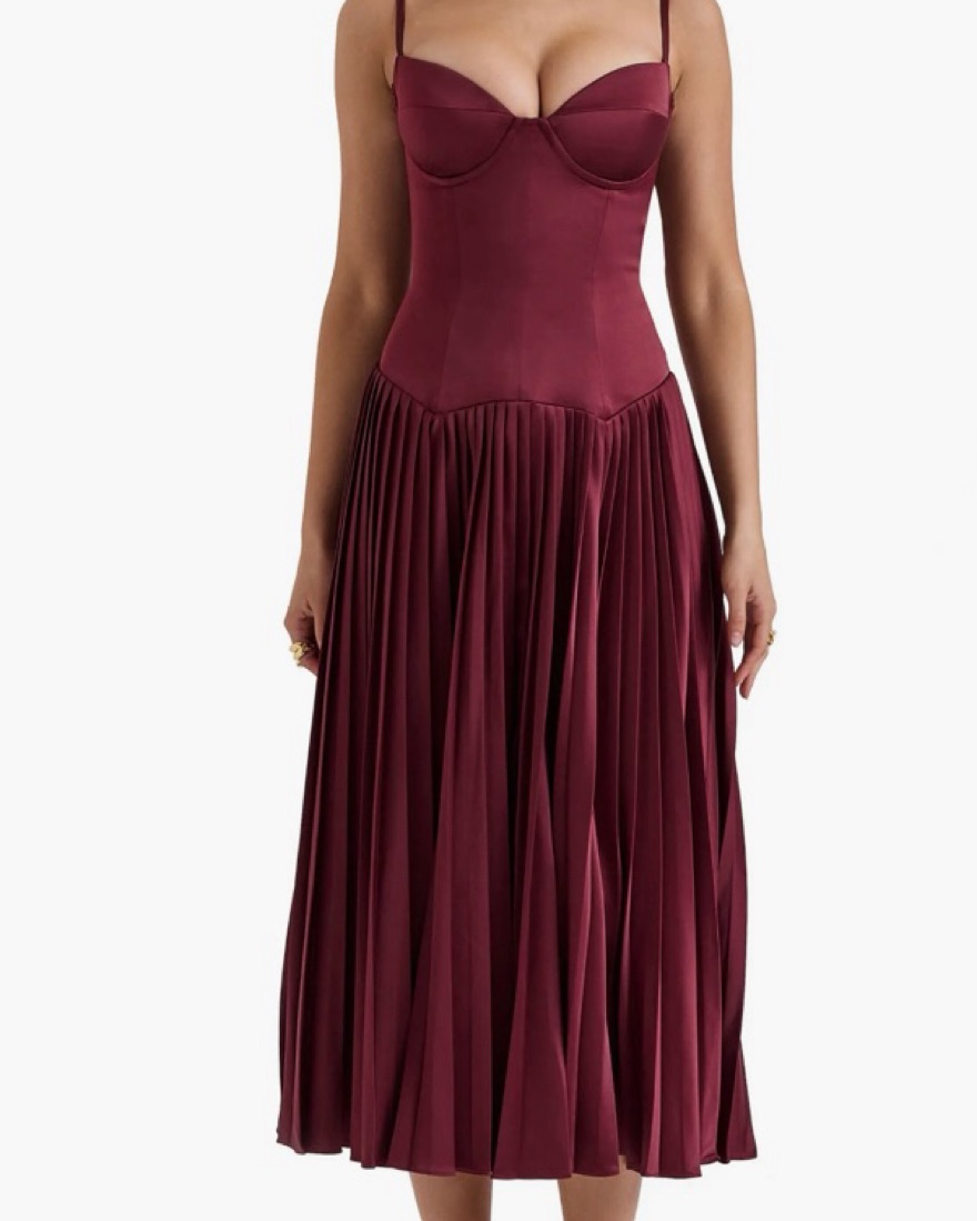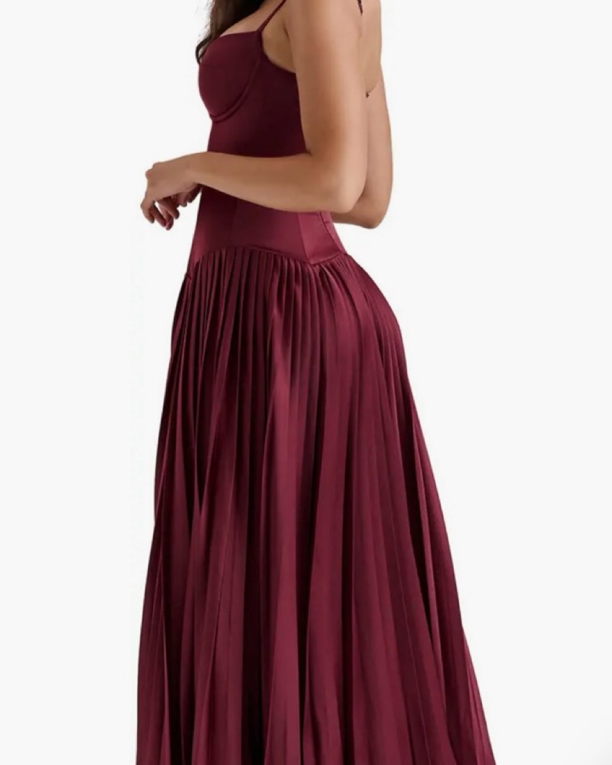 This stunning burgundy midi dress features a fitted bodice and a flowy, pleated skirt, perfect for a formal occasion or special event. Great condition- work once.