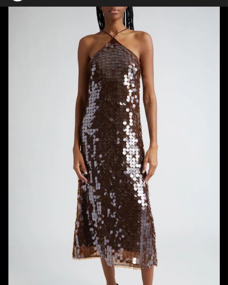 Elevate your look with this stunning midi dress featuring a sleek halter neckline and a shimmering sequin-embellished design. Perfect for a night out or special occasion.