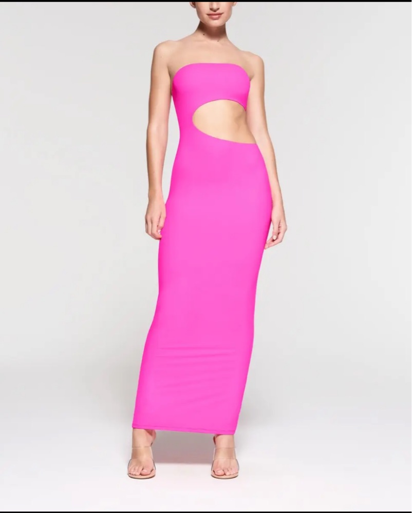 Such erflattering. This eye-catching midi dress is perfect for a night out or special event. The vibrant pink color and striking cutout design create a bold, stylish look.