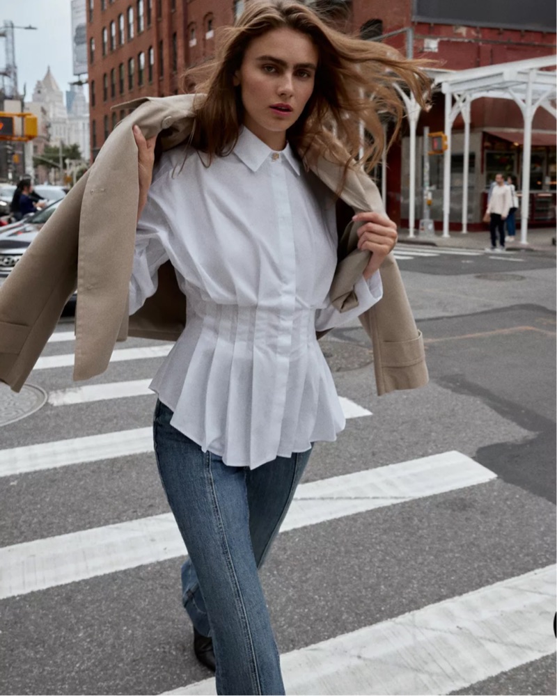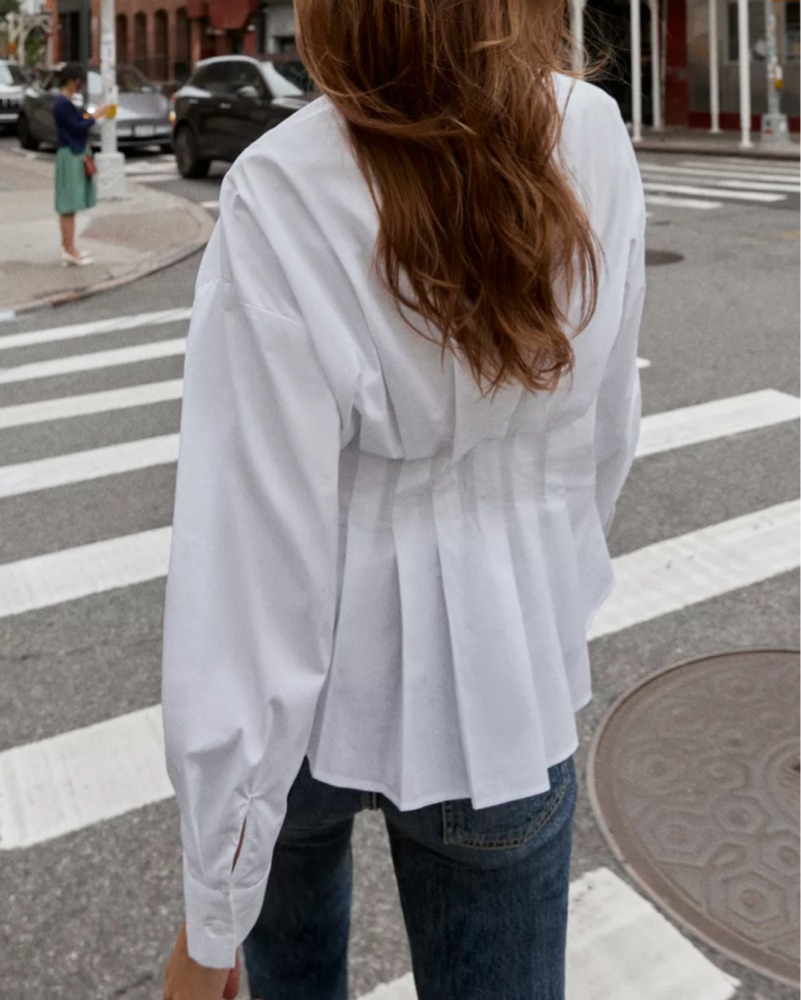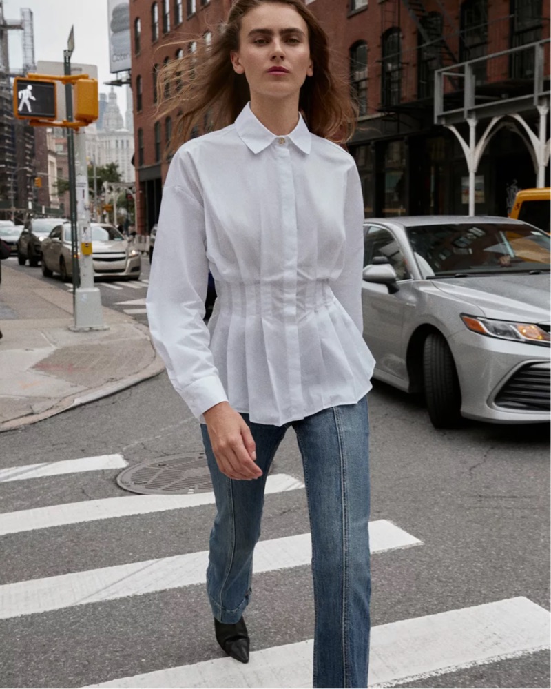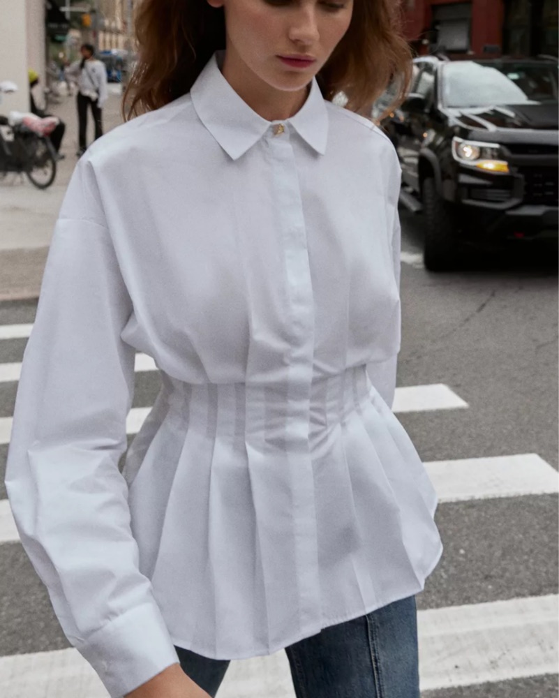 White button down poplin shirt with gold top button. Snatches the waist. Perfect for work or out on the town