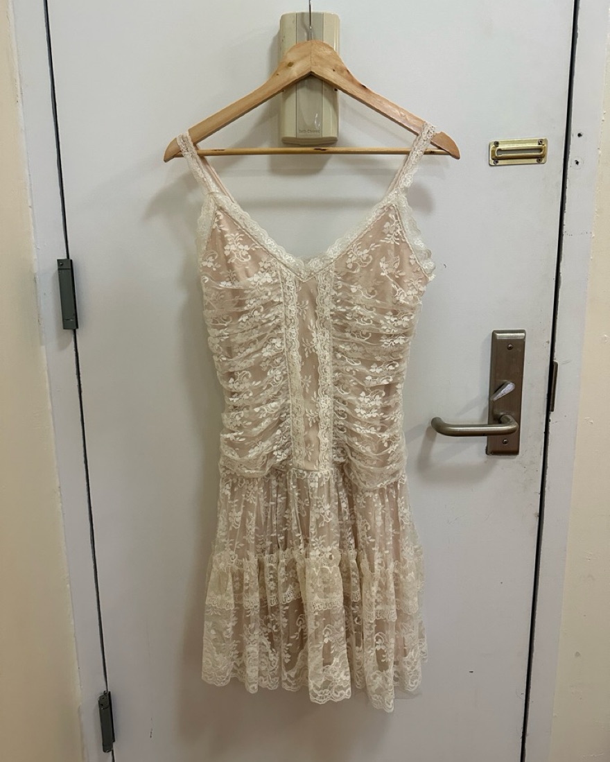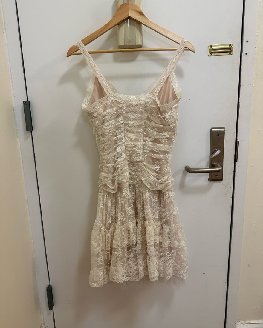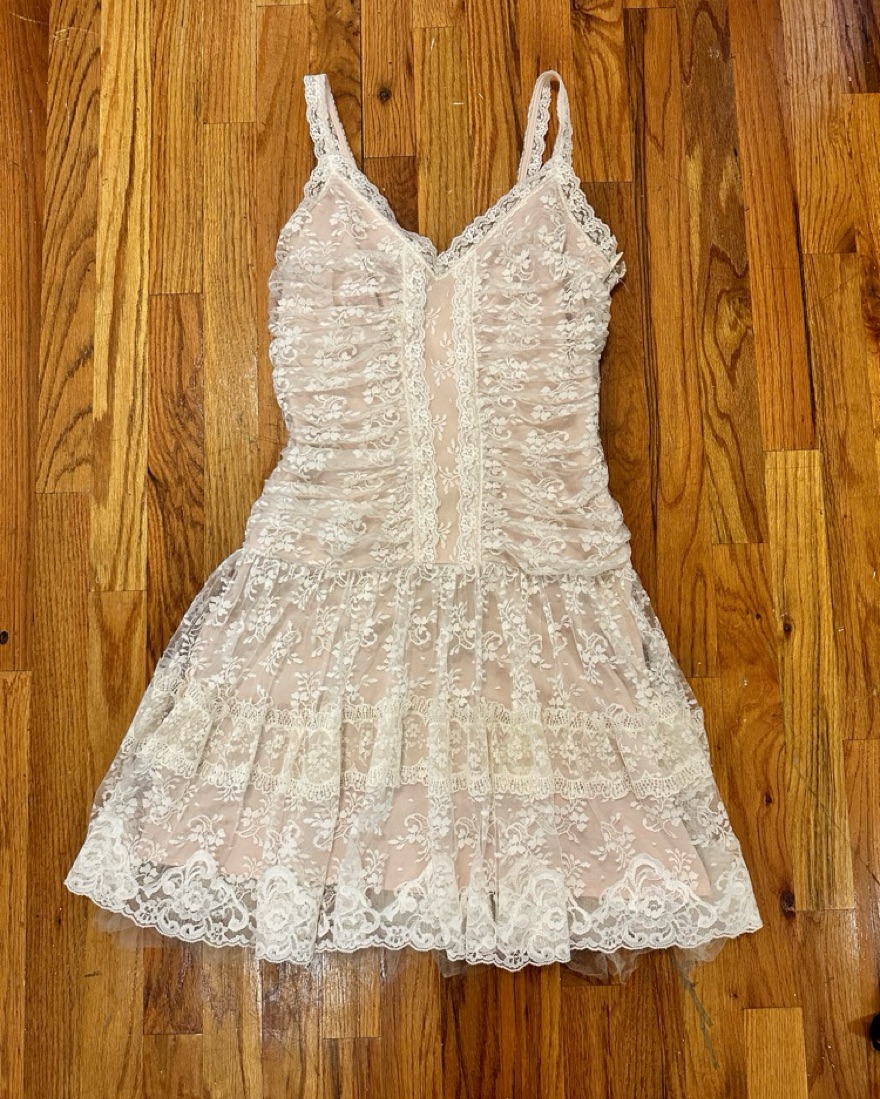 Cream-colored dress with beige lining. The top is ruched and has boning for support and structure. The skirt is tiered. Tagged a size 6 but best for a size 4/size small.