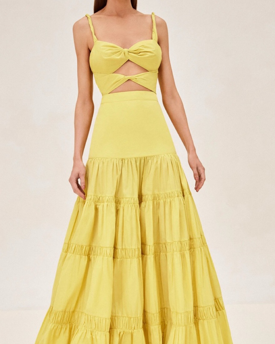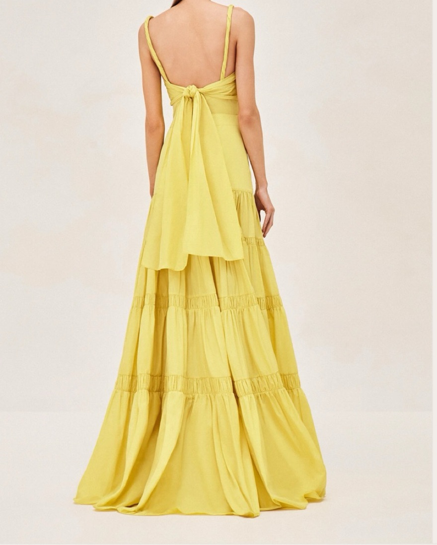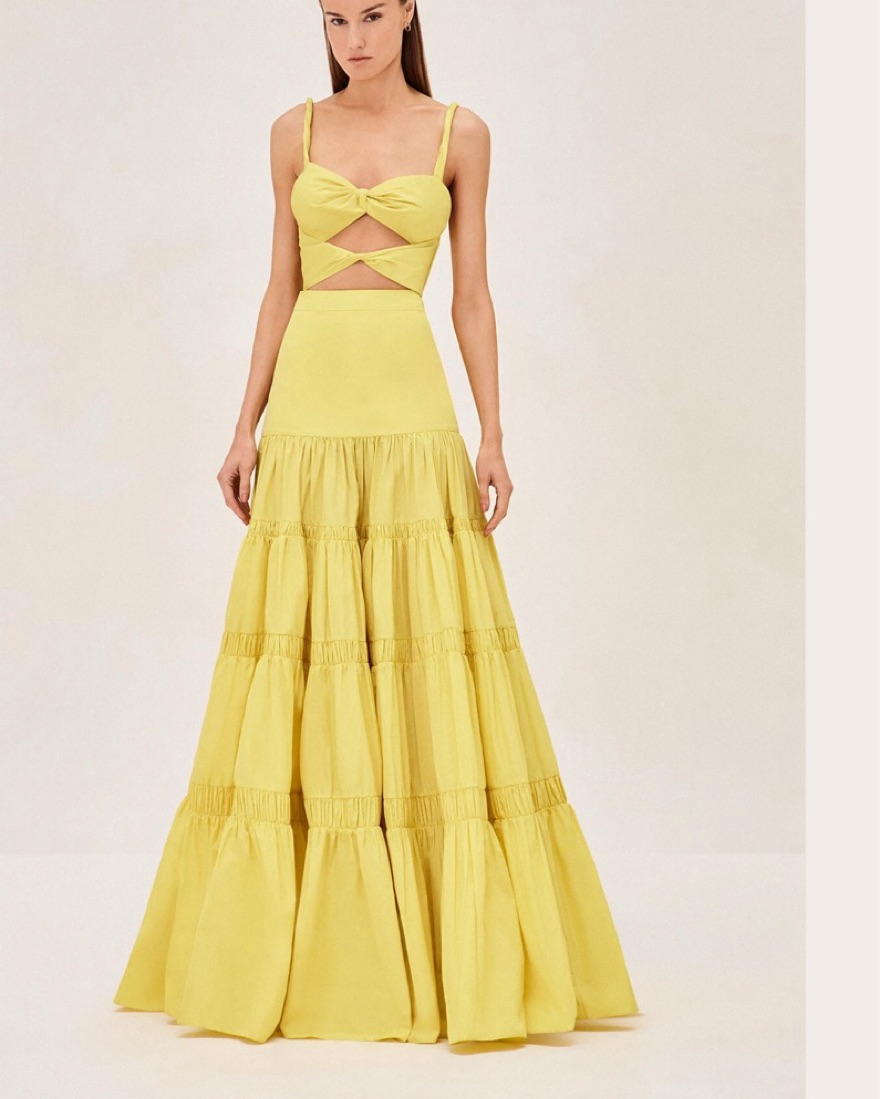The Chantalle Gown boasts a twist cutout bodice, a voluminous tiered skirt for a dramatic flair, and a back tie detail for a customized fit. Perfect for making an entrance at your next event.