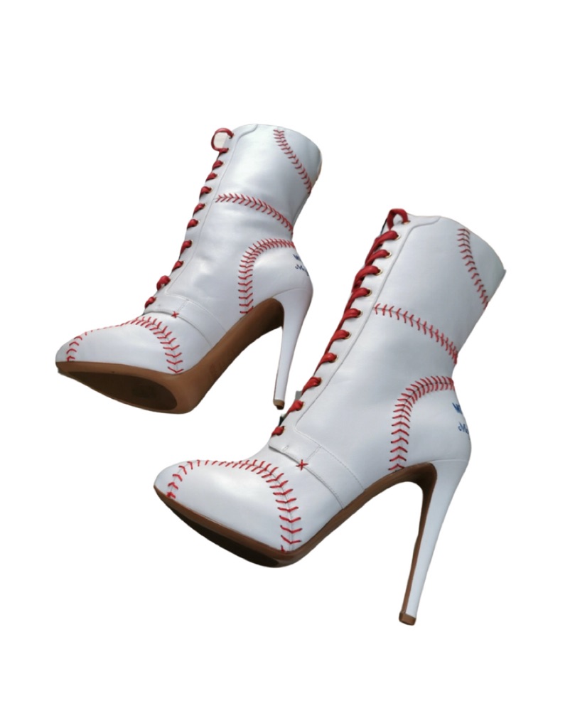 *RARE* Moschino “Major League”Pre-Fall 2014 stiletto boots. White calfskin leather with contrast red stitching and laces. Features “Moschino Official Major League” on rear counter. Incredibly unique and rare! US women’s 8 but run very narrow so probably better for a 7/7.5. Recently seen on Latto!
