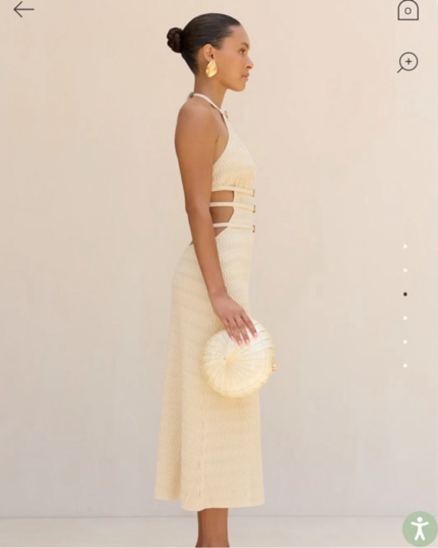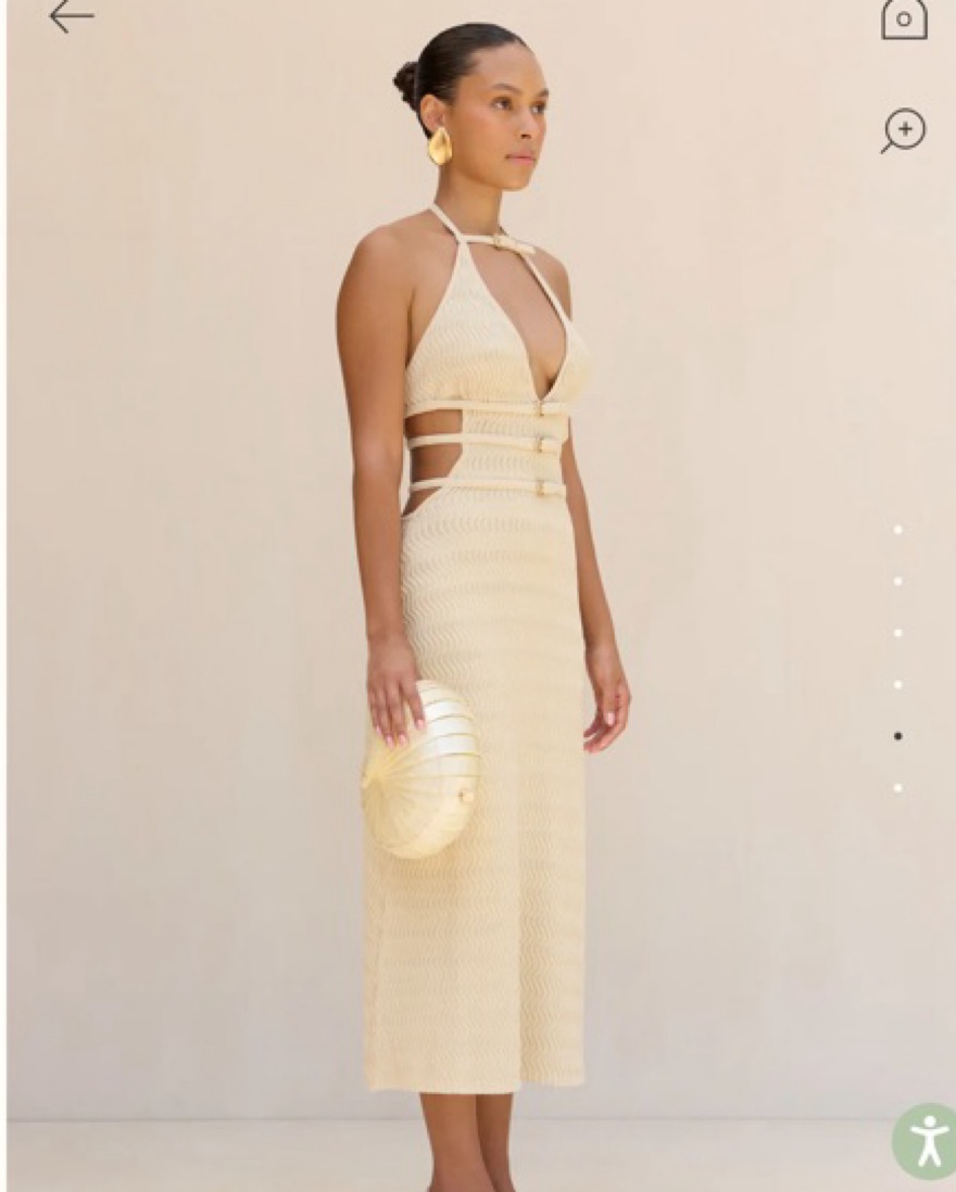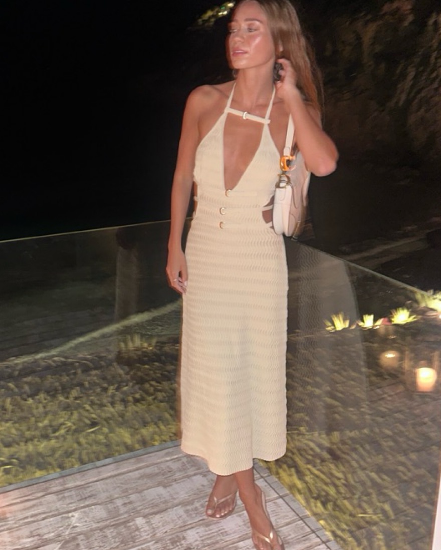 A classic halter knit midi-dress adorned with four adjustable buckled straps across the front that wrap around the back.