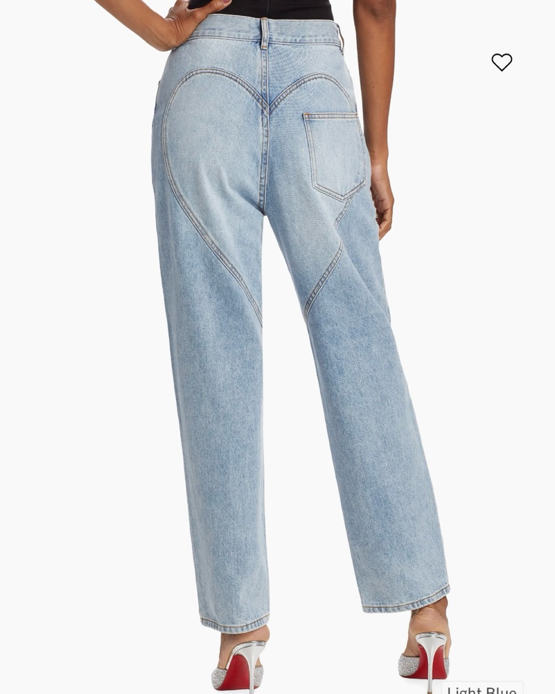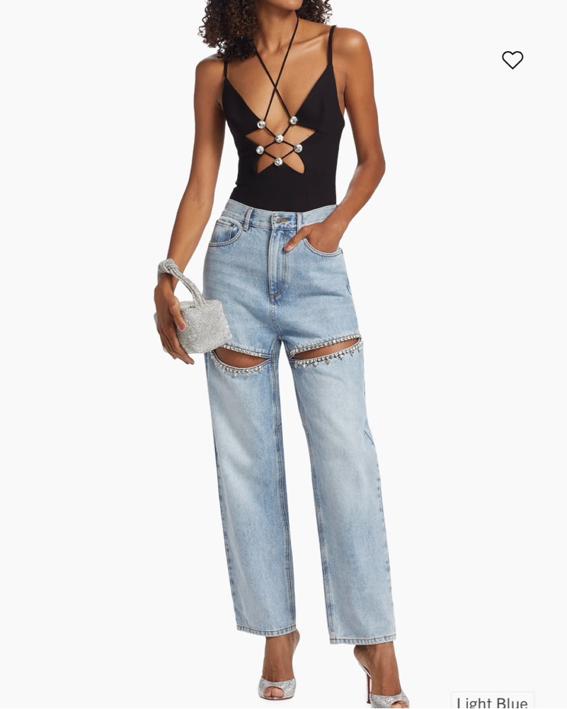 This stylish ensemble combines a sleek black bodysuit with statement-making denim bottoms, perfect for a night out or a special event.