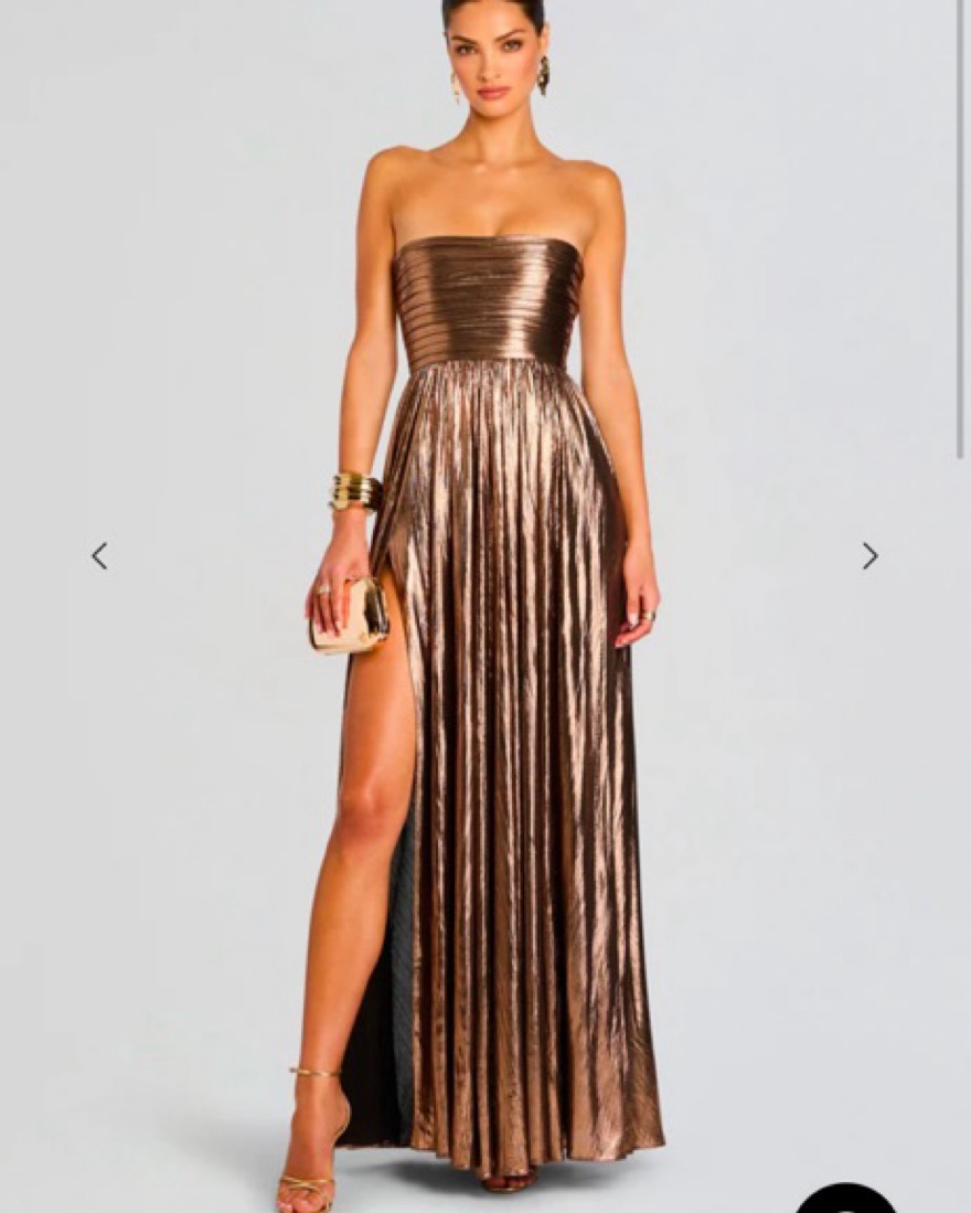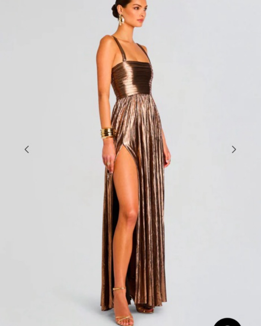 . This stunning lamé gown exudes luxury and sophistication, complete with a sexy leg slit and removable straps for a versatile and elegant black-tie look. (doesn’t come with straps) Plz only rent if 5”7 or taller!