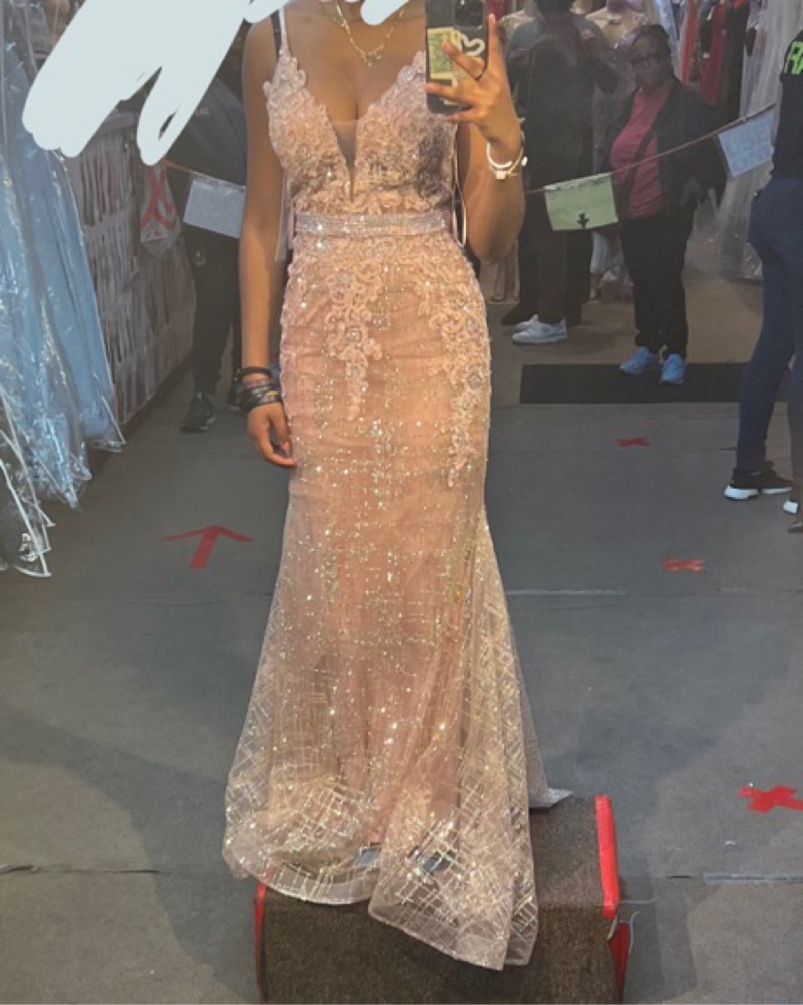 This dress was super cute used it for prom but can be used for ither occasion. It has a small train and shows a bit of cleavage in the front coverd by lace. Not to heavy and not too tight, easy to move around. glitter, runs a slightly big so a small is like not so tight do if your a medium it fits