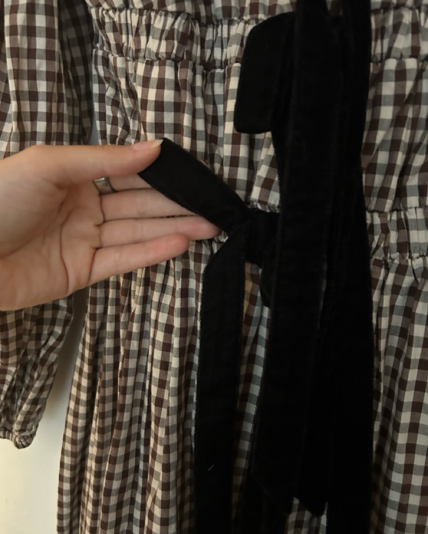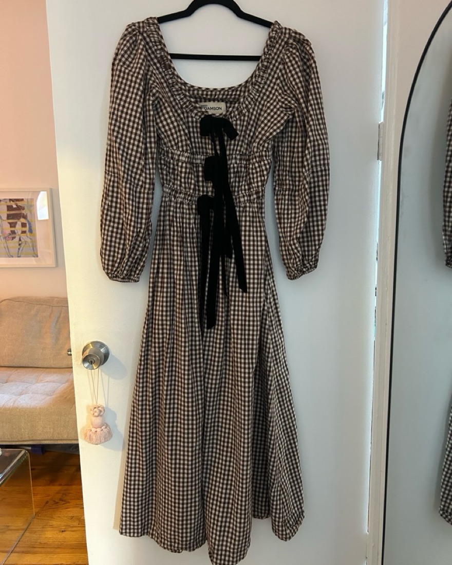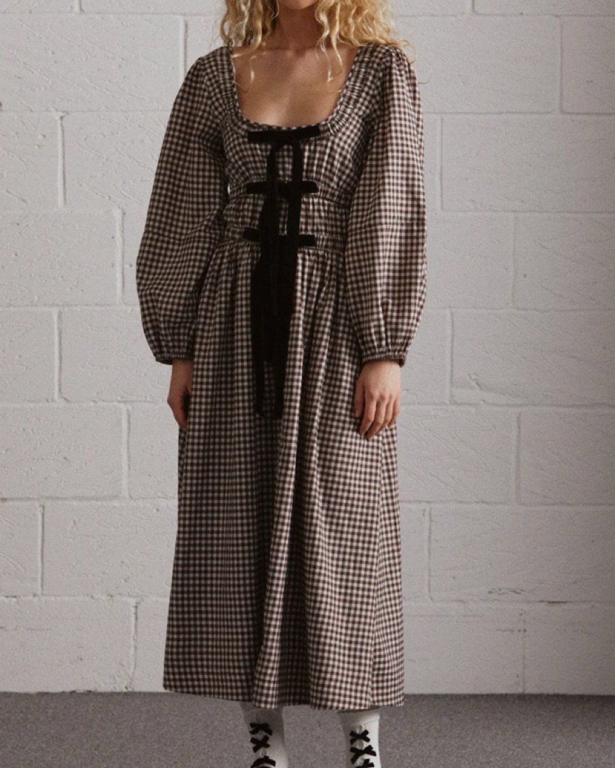 Size UK 8, US 4. Our Dakota dress is our long sleeve all over check design midi dress featuring puff sleeves, a scoop neckline and front black bow styling.