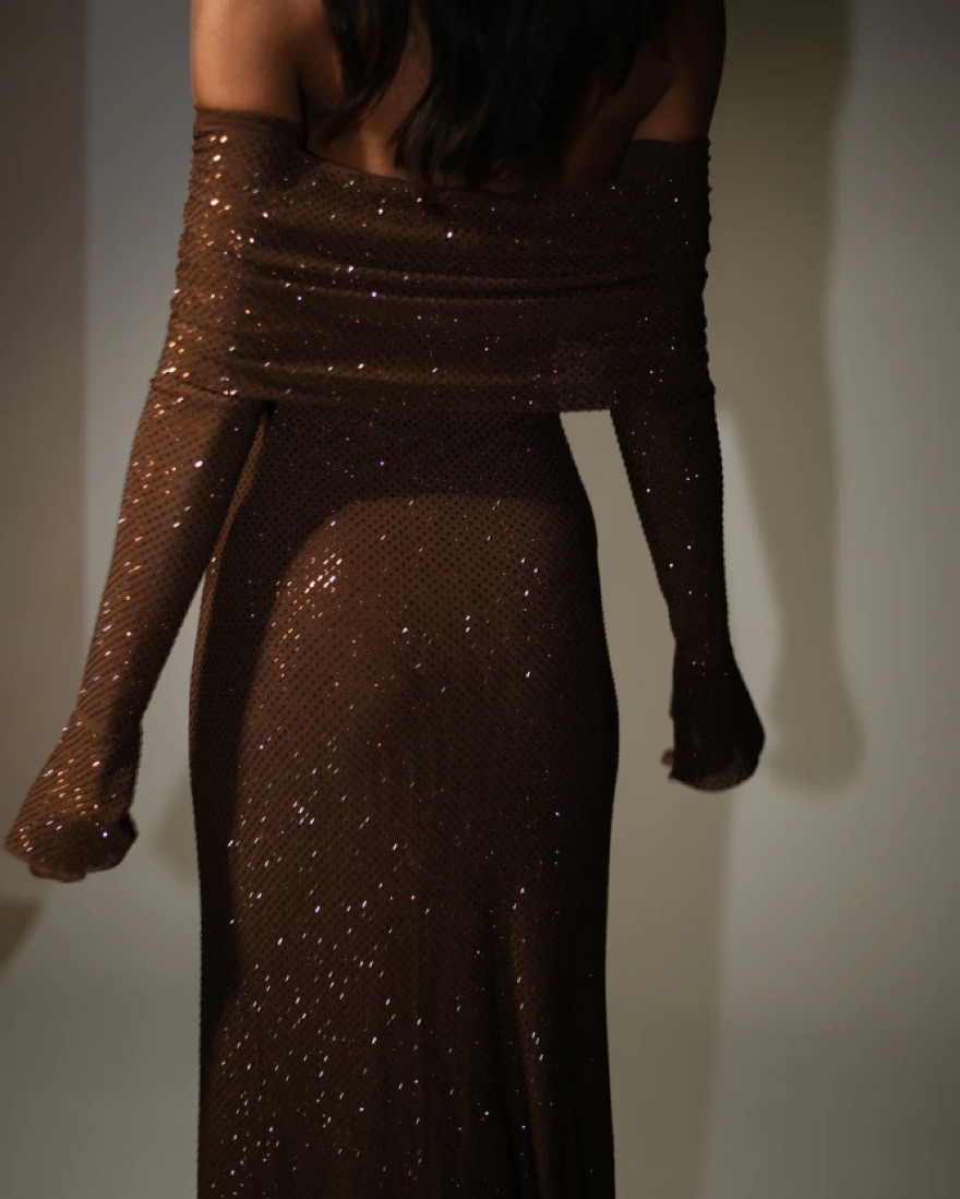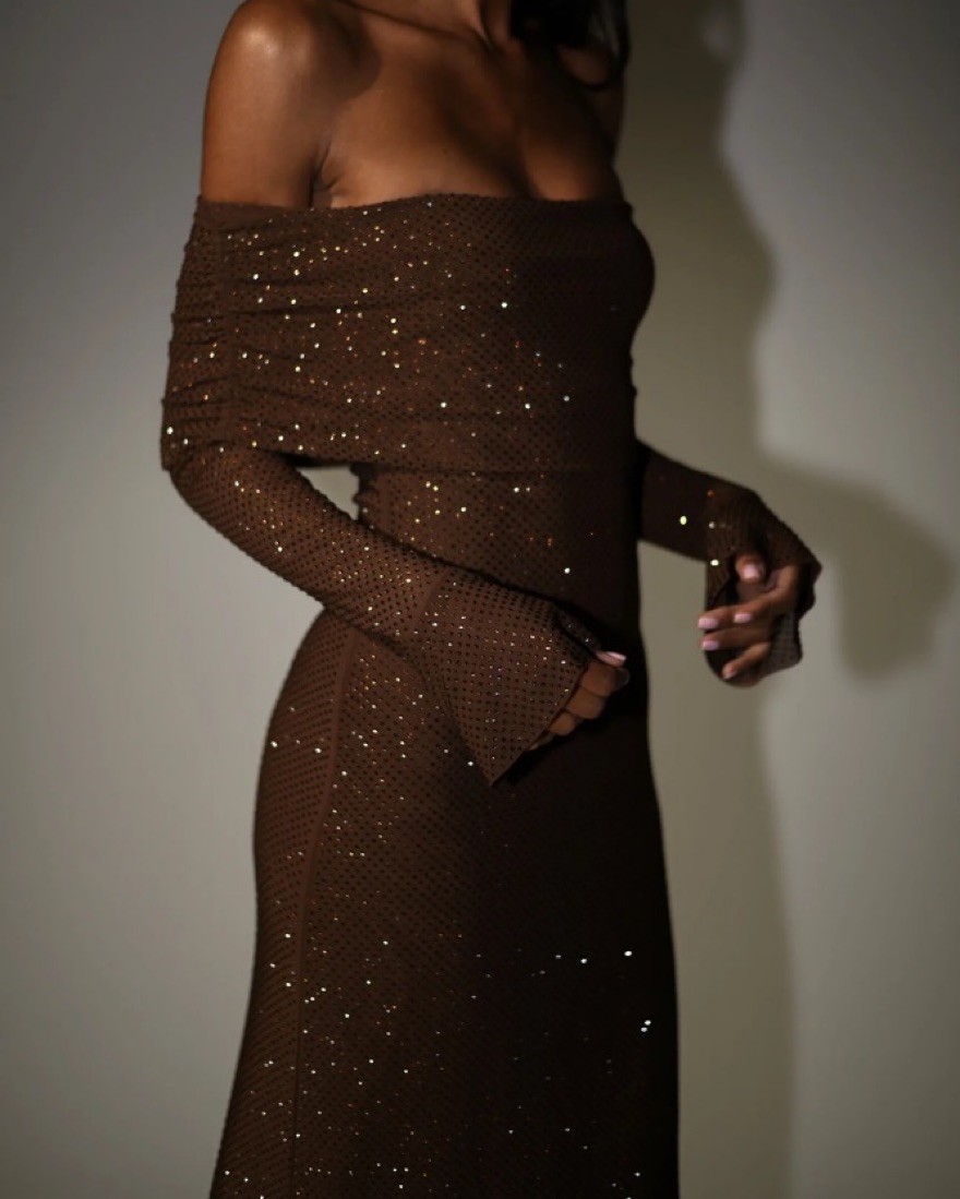 Chocolate fitted crystal maxi dress with straight skirt and long sleeves. The off-shoulder neckline pairs perfectly with the fabric overlay over the bust, while the long sleeves cinch to your arms before transitioning into flared hems.