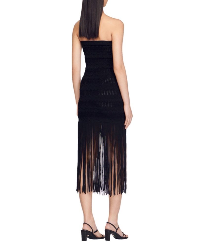 This chic black midi dress features a strapless neckline and a striking fringe trim along the hemline, creating a modern and alluring silhouette perfect for a night out or special event.