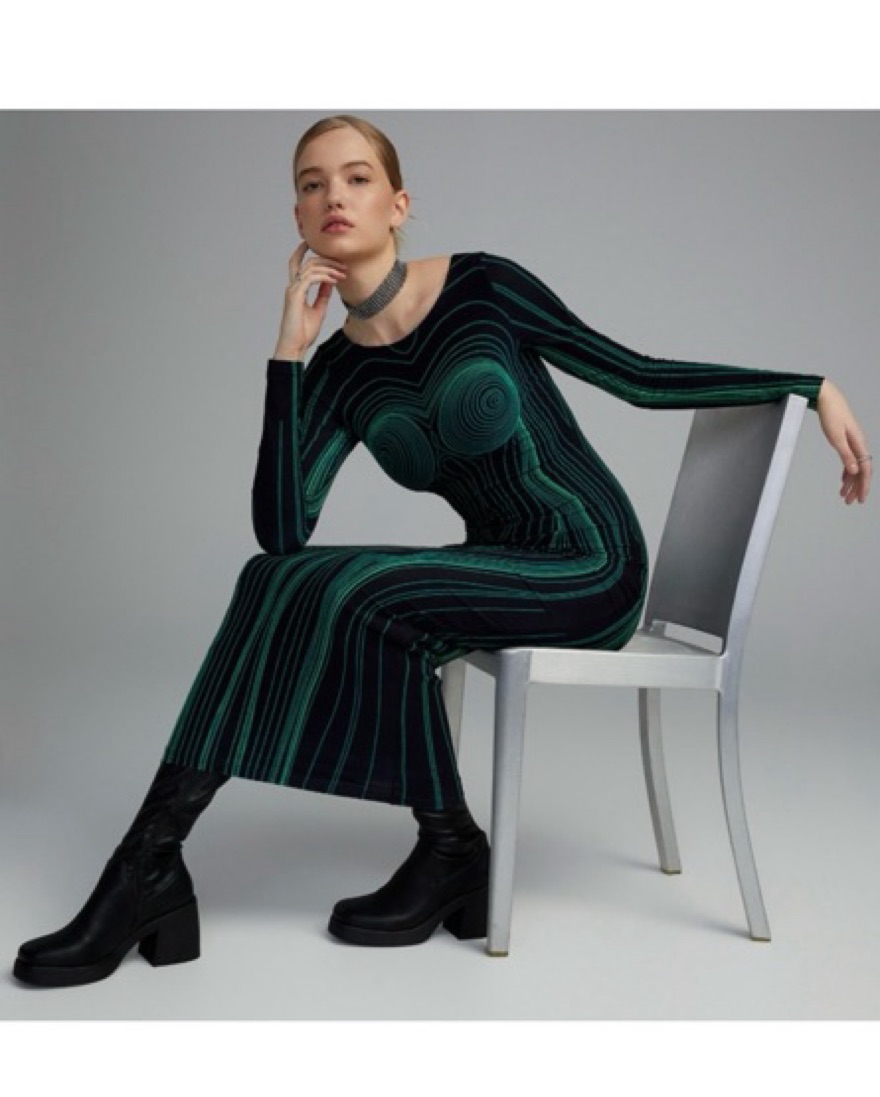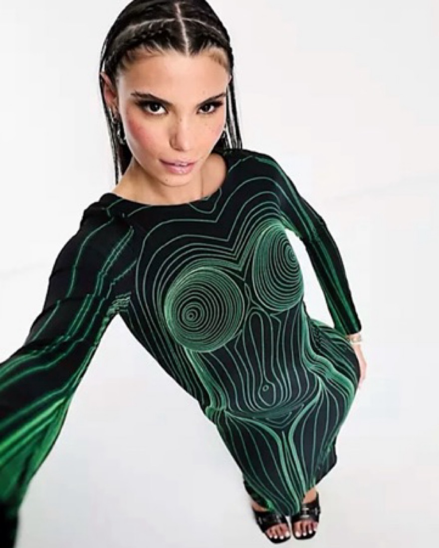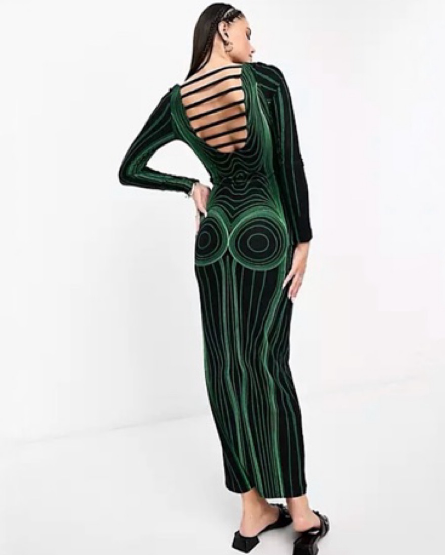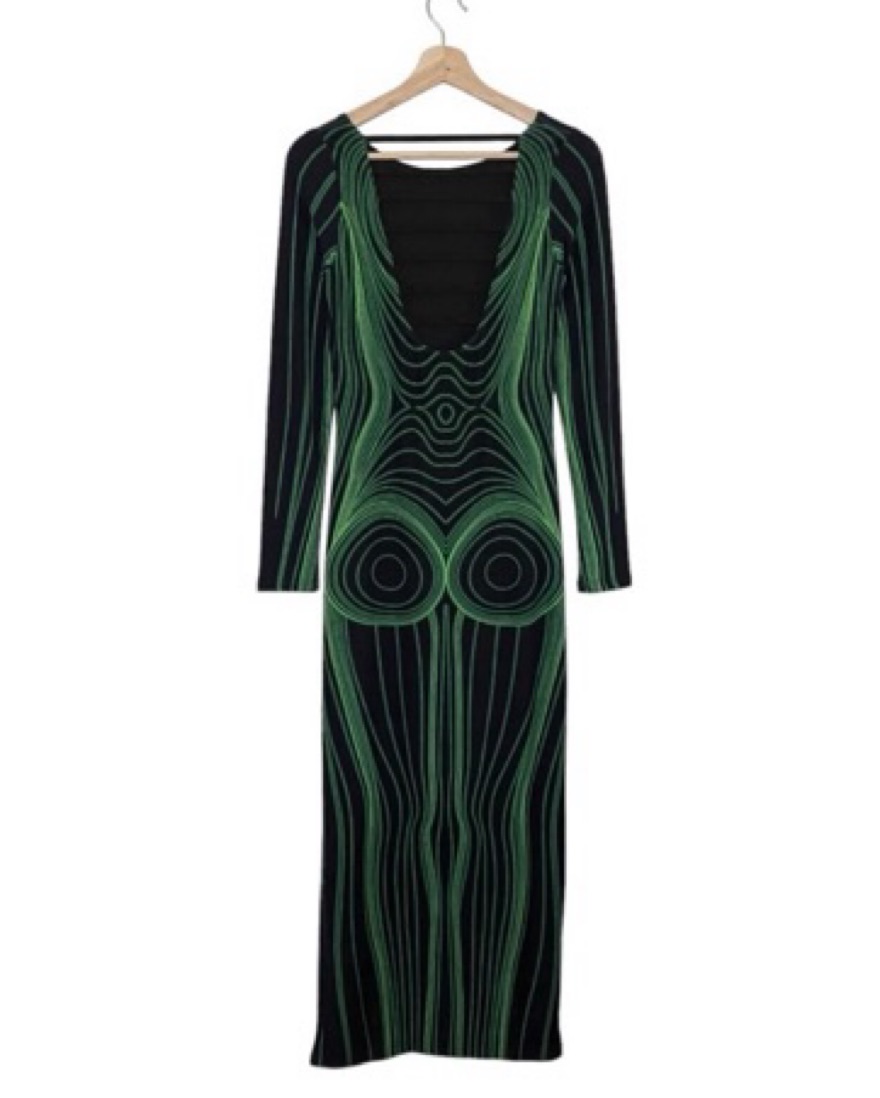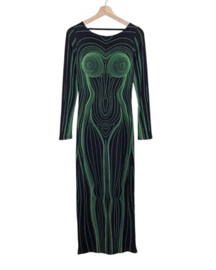 The Kript Corpo Illusion body con long sleeve maxi dress in black / green combo. Elastic open back, fully lined