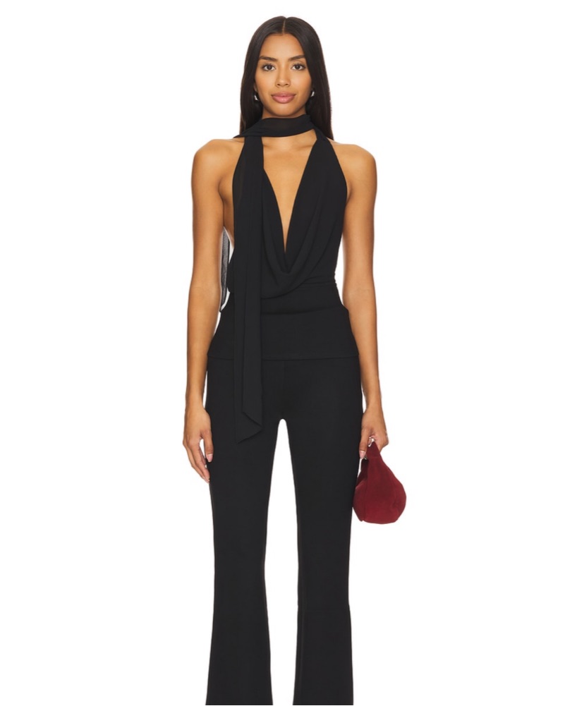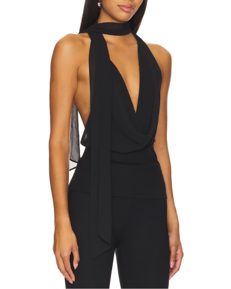 Halterneck tie closure Draped plunging neckline Georgette fabric with ponte fabric hem