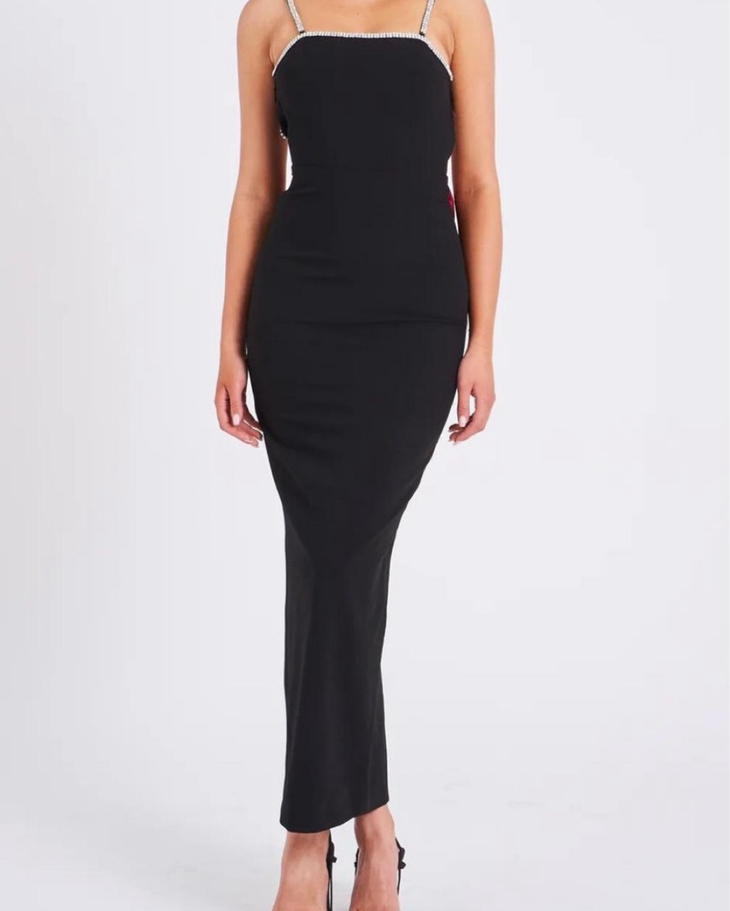 A stunning black maxi dress with a dramatic open back and a bold fuchsia bow. Perfect for a formal event or a night out on the town.