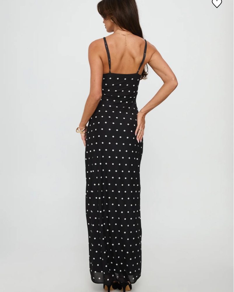 This stunning polka dot maxi dress is perfect for a summer garden party or romantic date night. The flowing silhouette and flattering v-neckline create a feminine, elegant look.