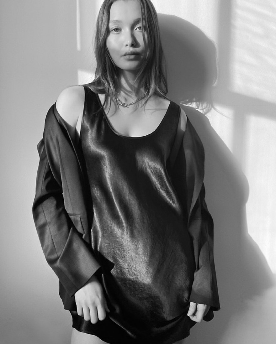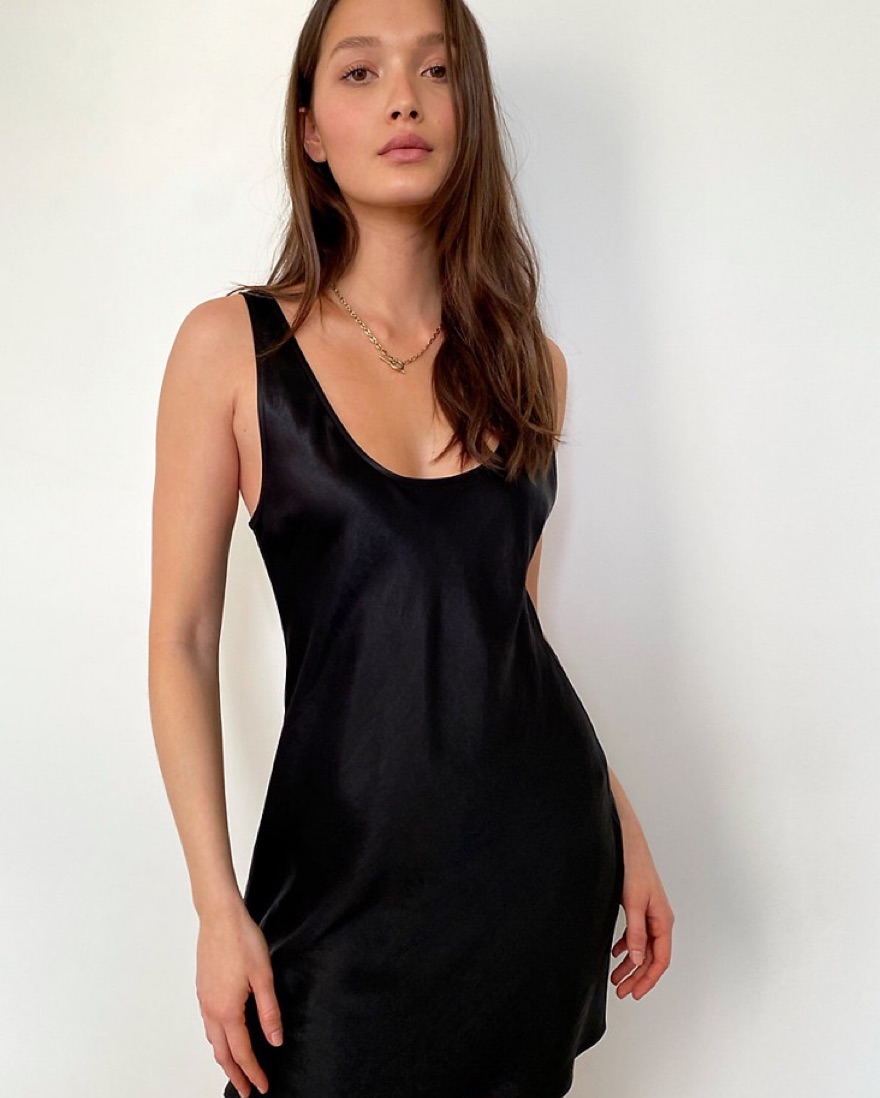 This is a slip-tank mini dress with a scoop neckline and bias cut that drapes beautifully. It's made from a glossy, silk-like fabric