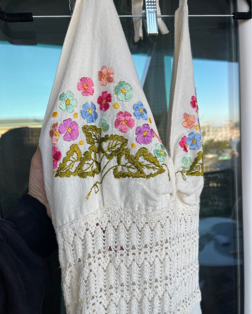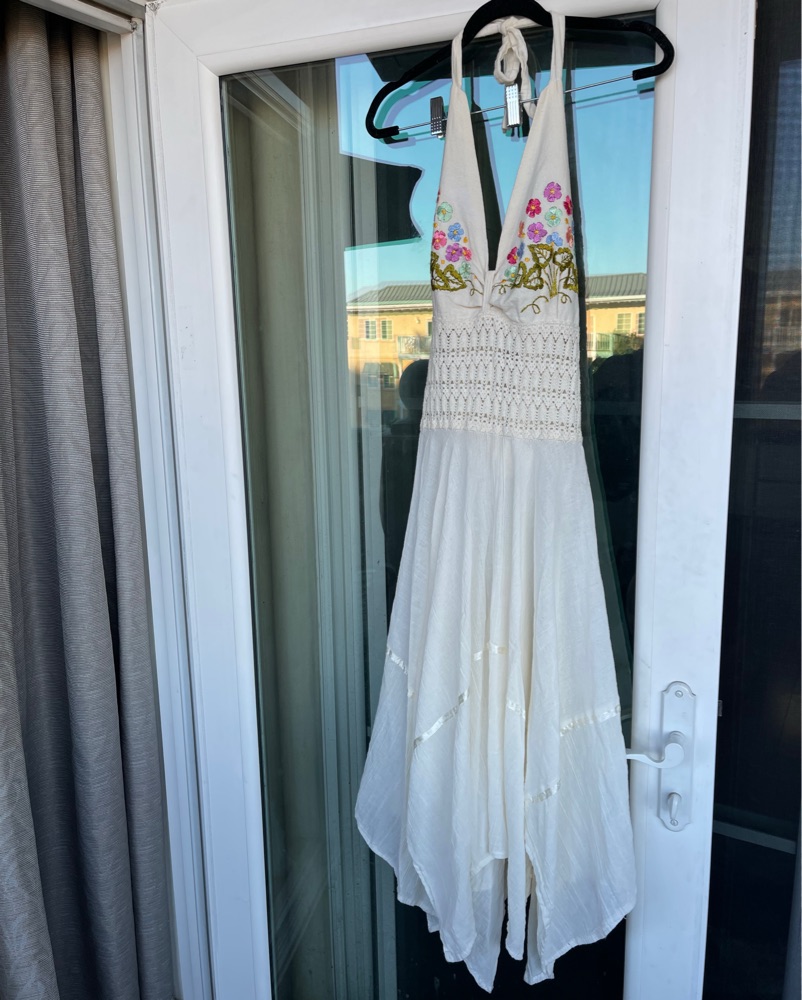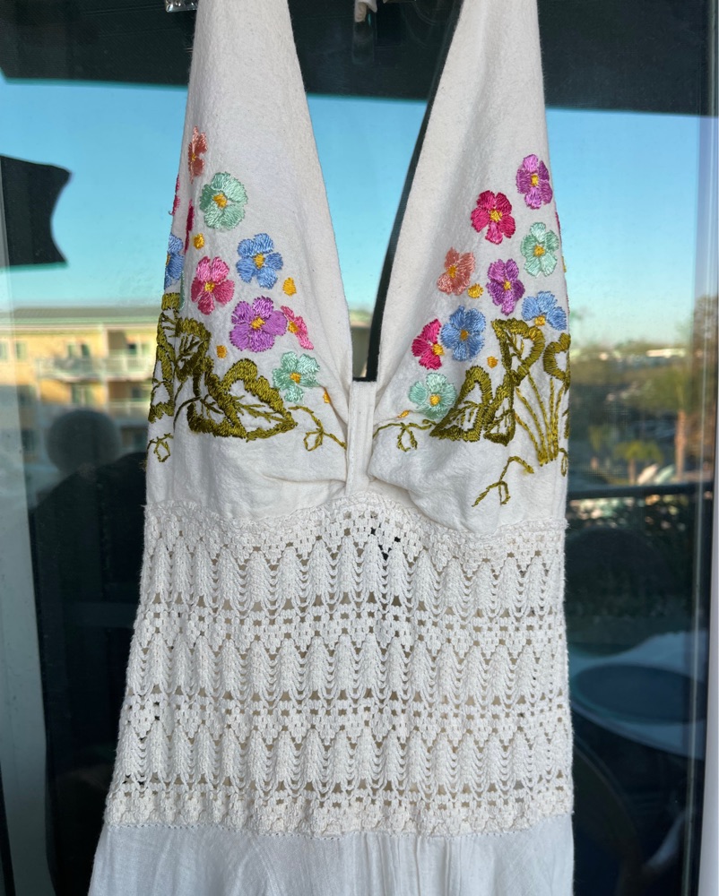 This stunning white maxi dress is perfect for a summer wedding or evening garden party. The intricate floral embroidery and delicate lace detailing add a touch of elegance.