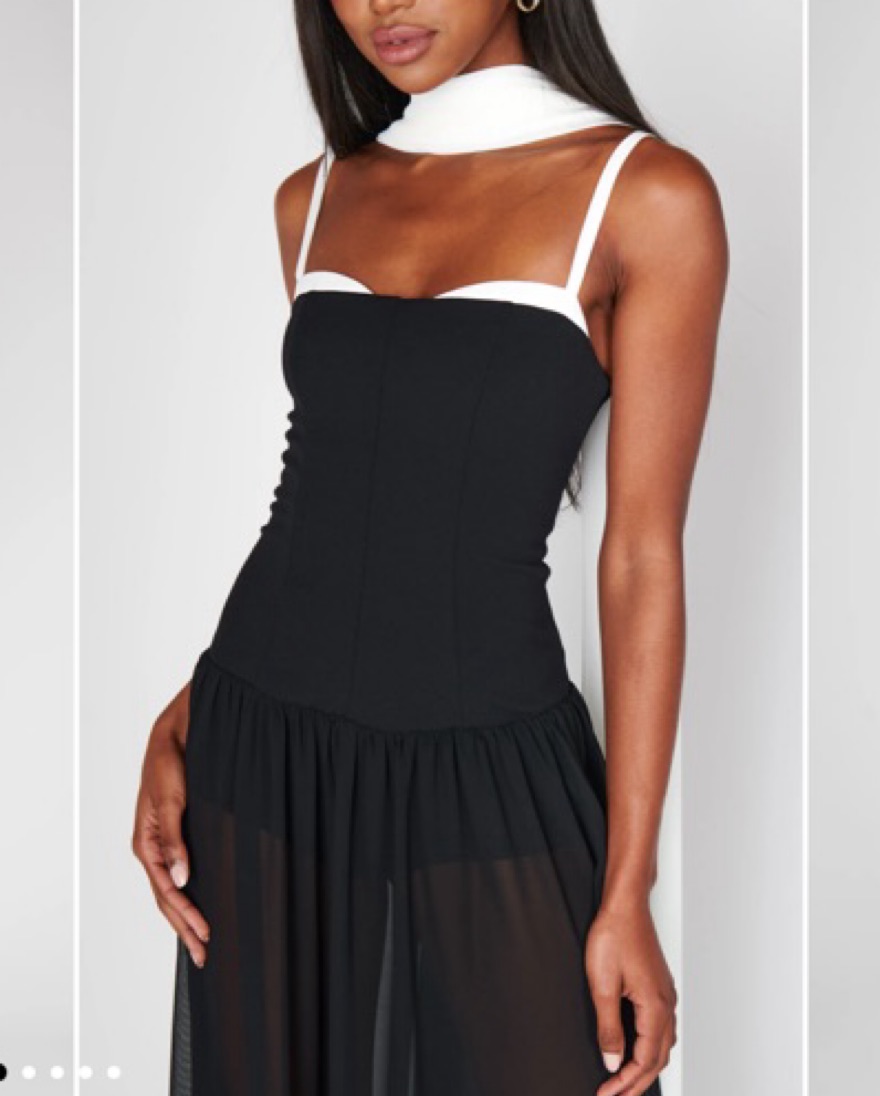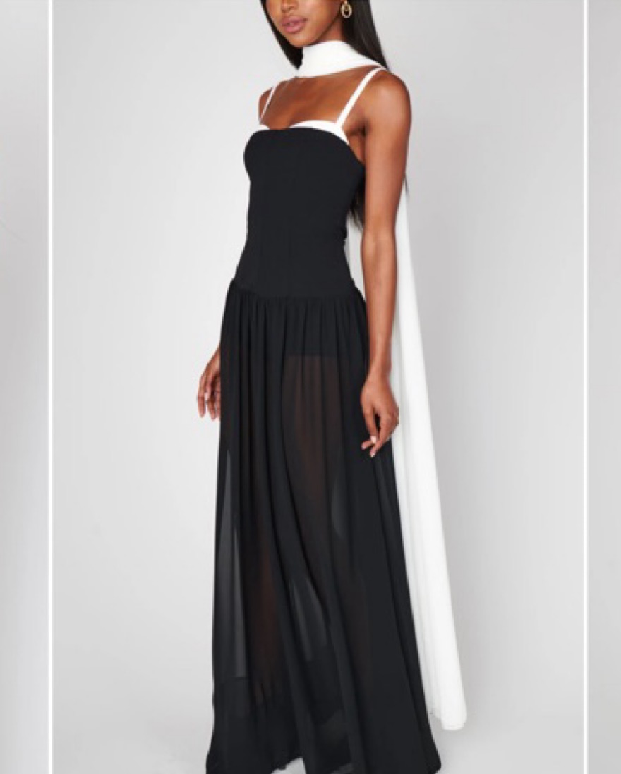 Super cute drop waist, sheer skirt, and a fitted body maxi dress. Comes with shawl.