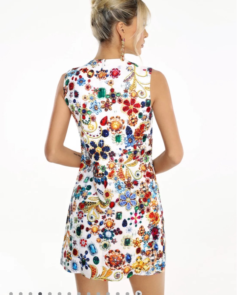 This statement dress features a captivating floral pattern with intricate embellishments that will elevate any special occasion.