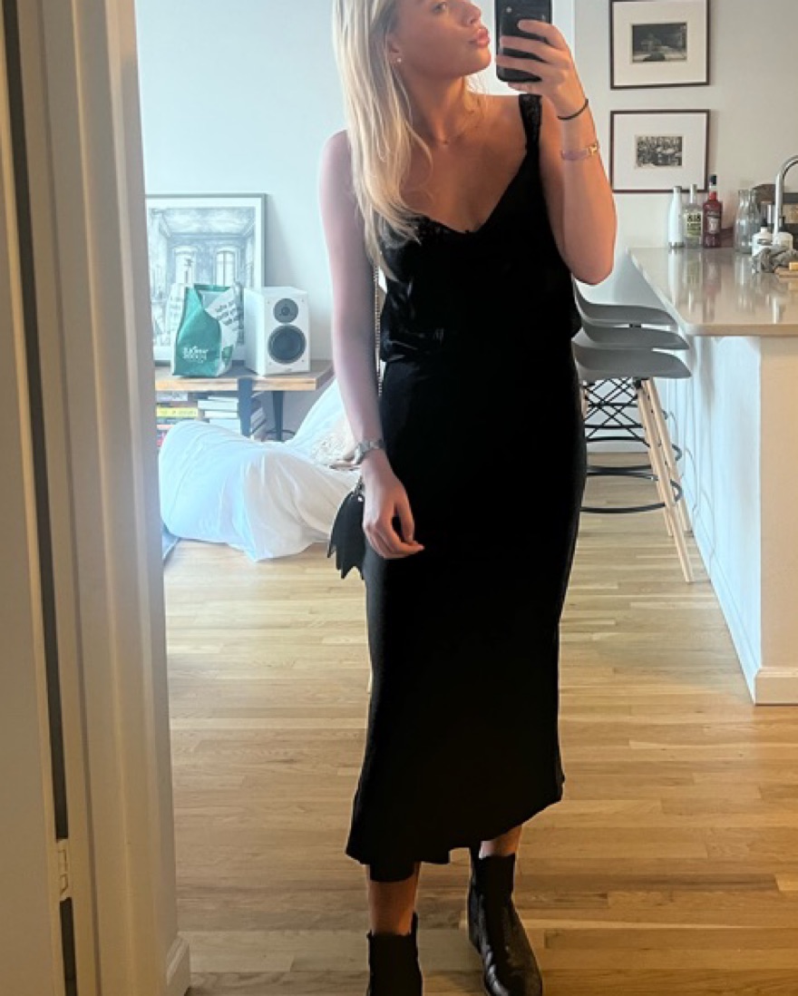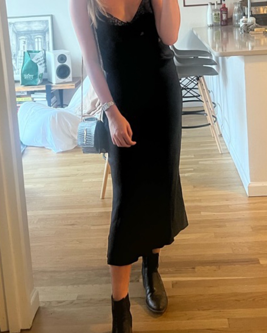 Black Midi Skirt from James Perse! Such a great basic looks cute with any top i love to pair it w a scarf top! I thought it was silk but its actually a modal cupro mix, feels like lightweight silk.