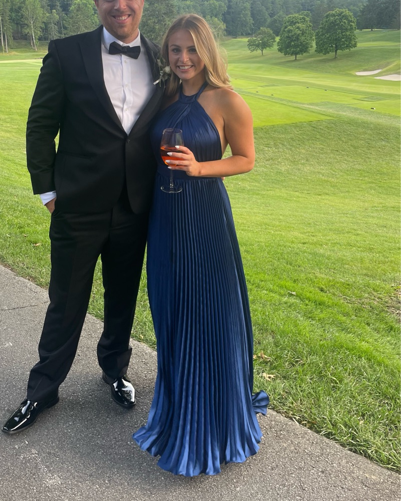 Navy blue long formal dress with a key hole cutout and open back. Perfect for a black tie event, gala or wedding guest dress.