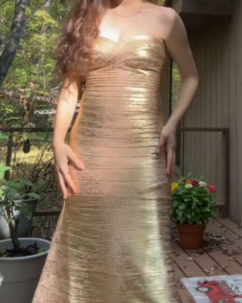 PLEASE READ! I have two of these hence the second listing if one dress is booked for your desired date, check the other!! Herve Leger gold metallic strapless gown size small. bandage gown fitted fits smaller sizes as well