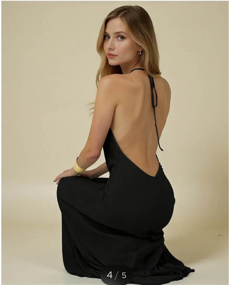 This long black low V tie around neck dress with low drop open back and shell detail on from perfect for a night or a vacation I love this dress