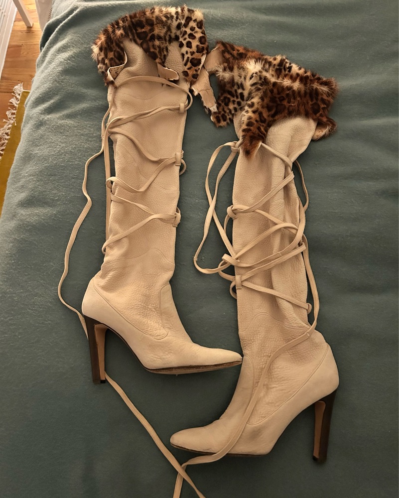 Sexy & fun! Over the knee with wood heel (slightly thicker than a stiletto) with super soft fur (believe it's rabbit but not 100% sure).