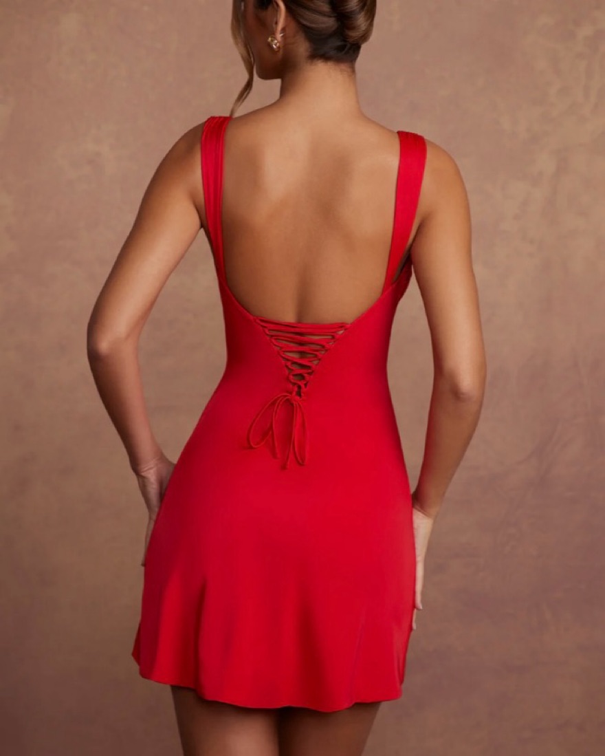 90s style red mini dress with low back, lace up detailing. So sexy and romantic! Has a slight a line fit which make the most comfy/flattering hourglass shape! Perfectly covers the butt too!