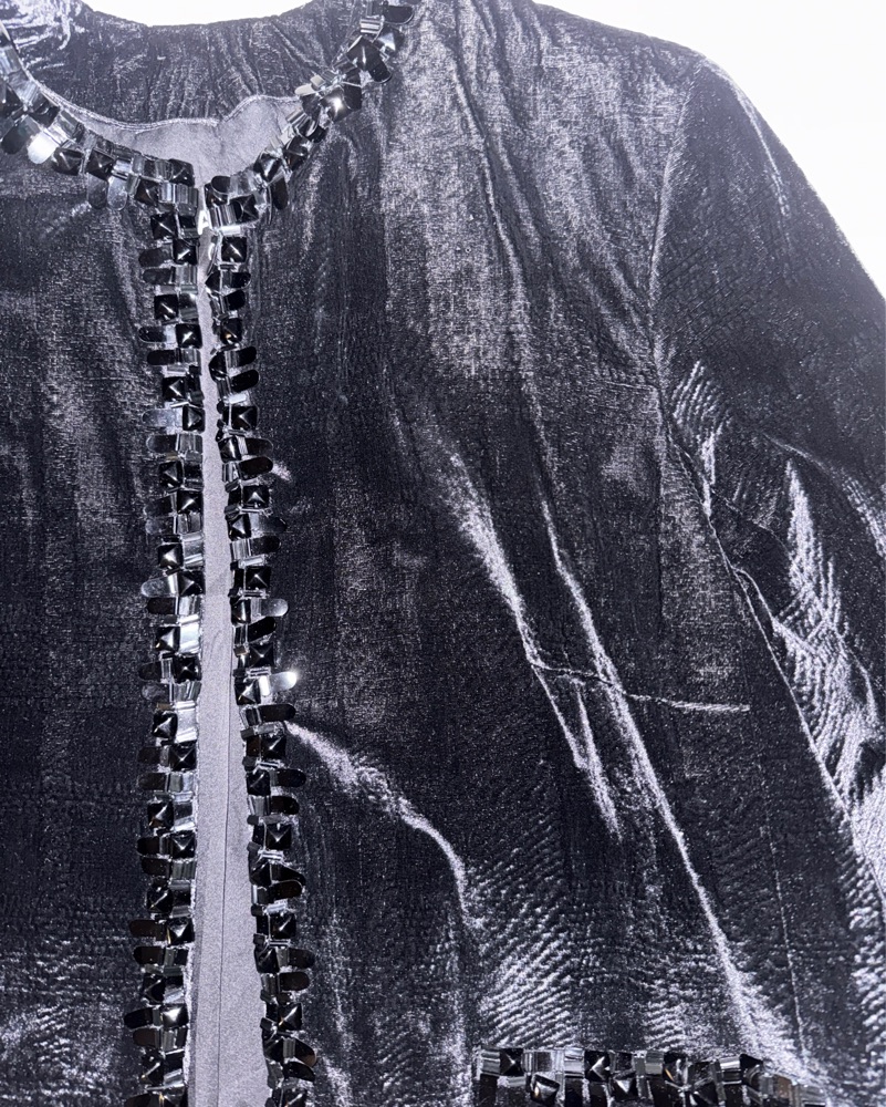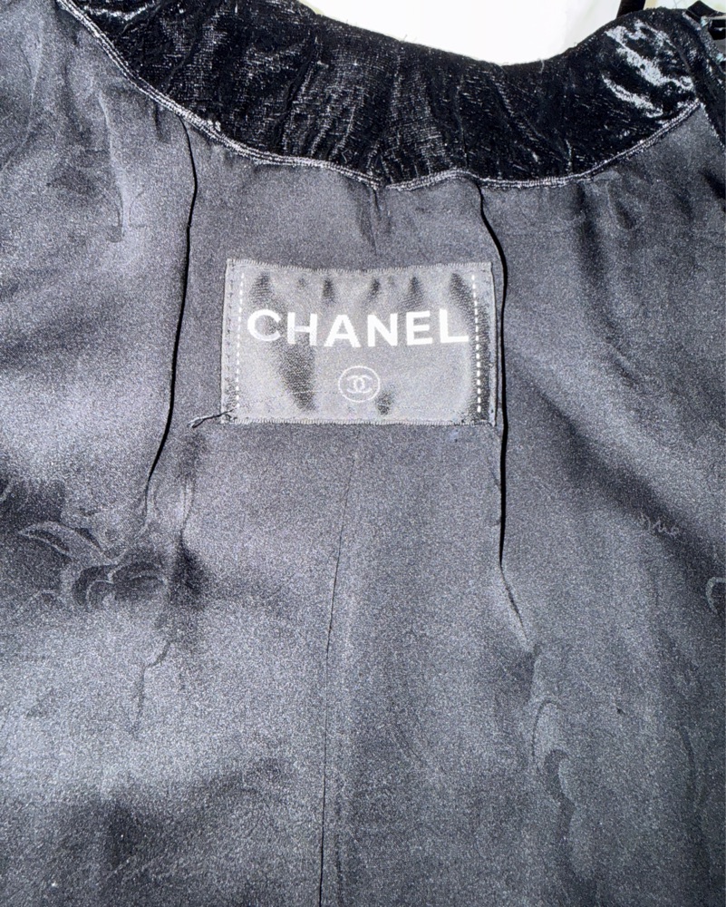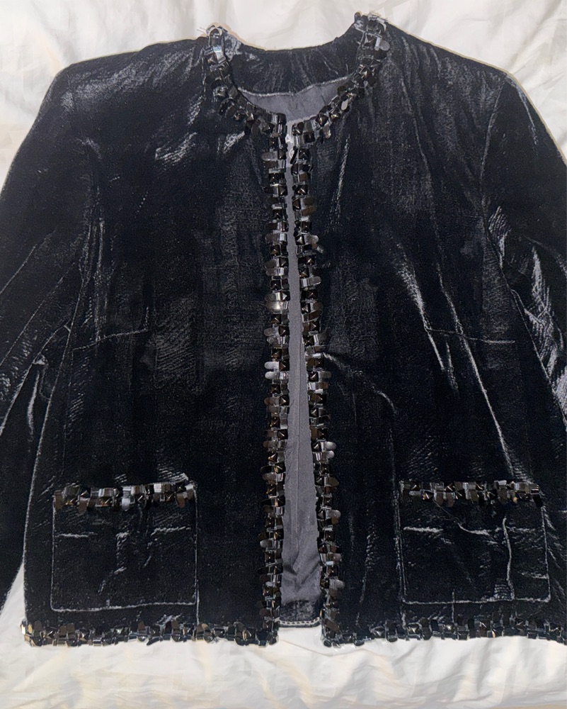 Black soft textured velvet jacket with sequin embellished trim, front patch pockets, and collarless design. Front hook and eye closure. From 2013 Pre-Fall Metiers D'Art Collection by Karl Lagerfeld. 70% Viscose, 22% Acrylic, 8% Silk. 100% silk lining. S/M