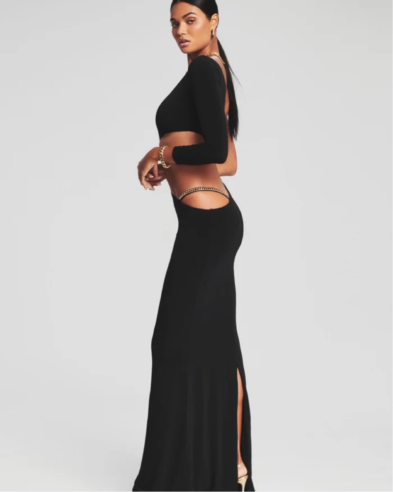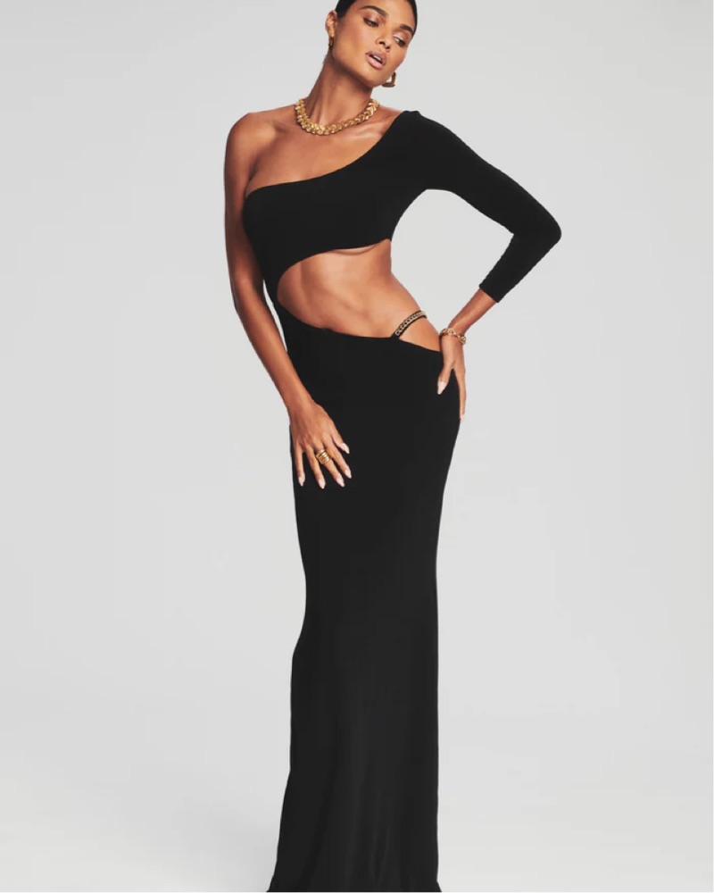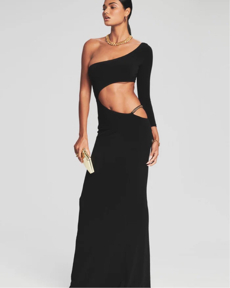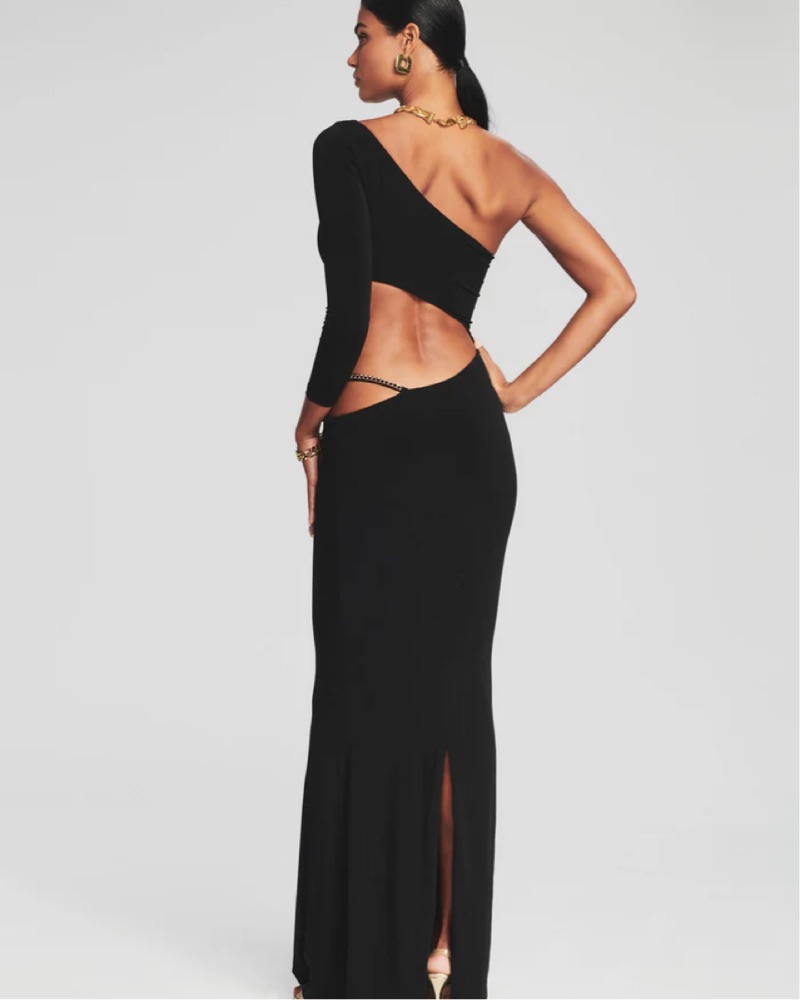 Ancient Greece's signature draping is reimagined for the modern goddess via our Whitney Dress. Crafted with a stretch fabric meant to hug your curves in all the right places, this style features an asymmetric long sleeve, daring cutouts, and a sultry gold chain detail at the hip.