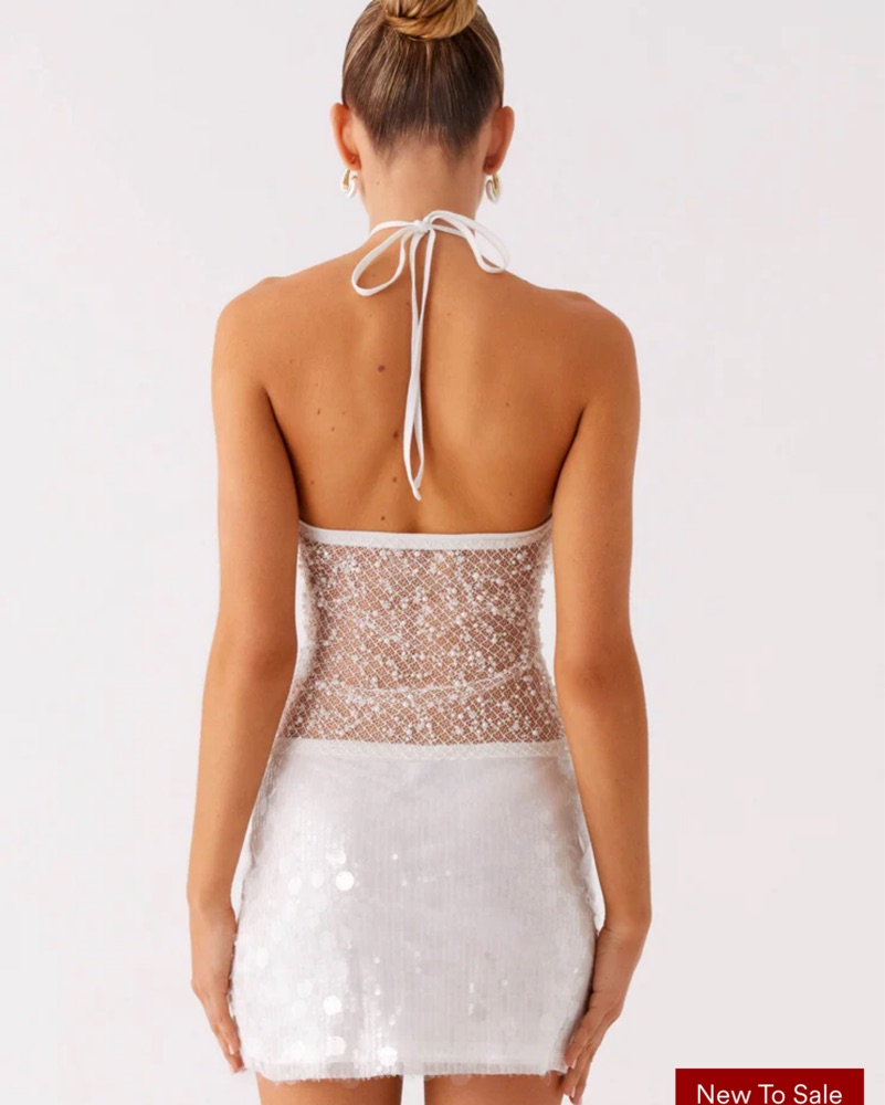 The Shelly Halter Top captures the essence of sunset elegance with its delicate beaded fabric and semi-sheer bodice. Featuring a halter neckline with thin neck tie straps and a lined bustier for support, this piece balances fragility and confidence for seamless day-to-night styling. Never worn!