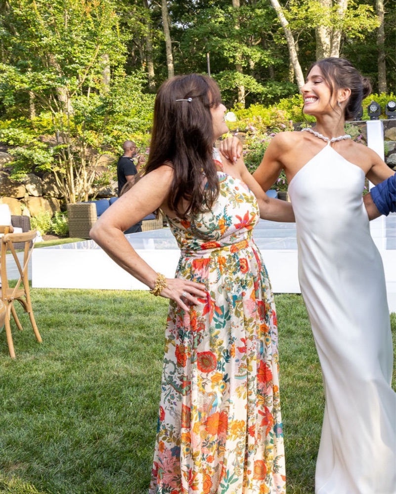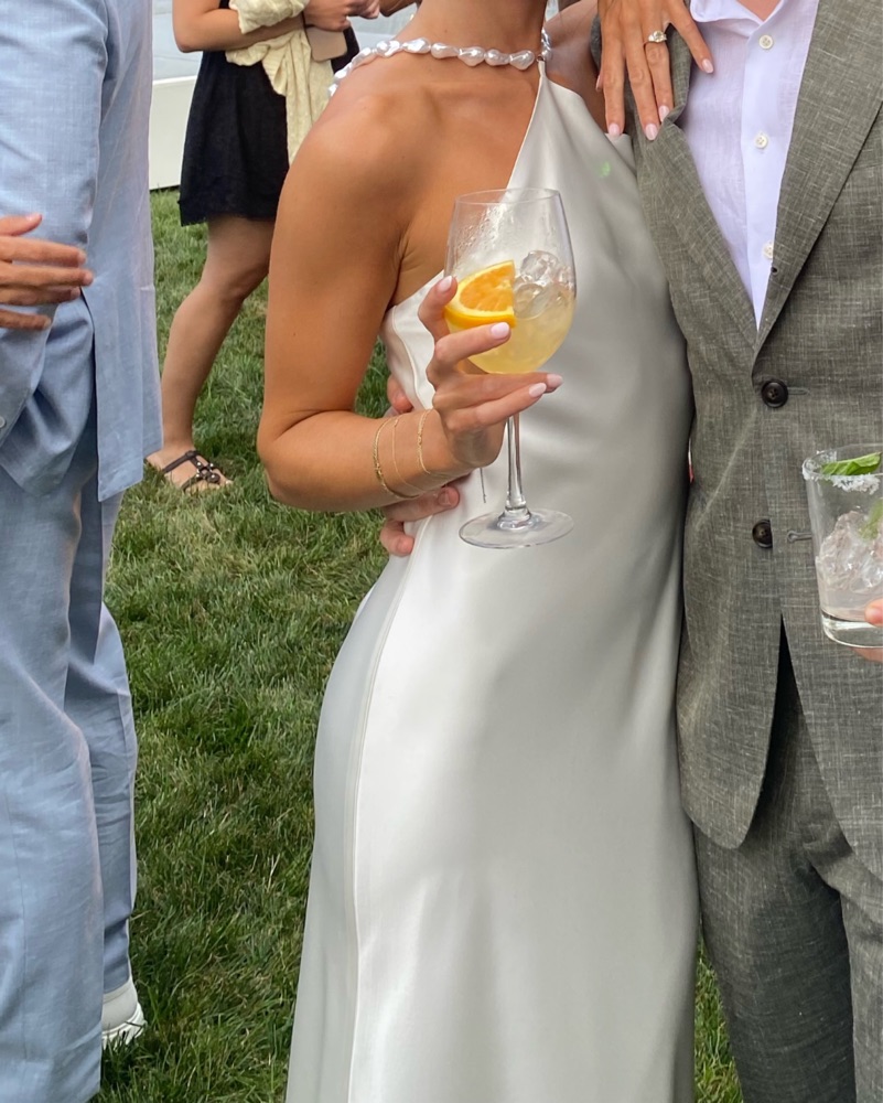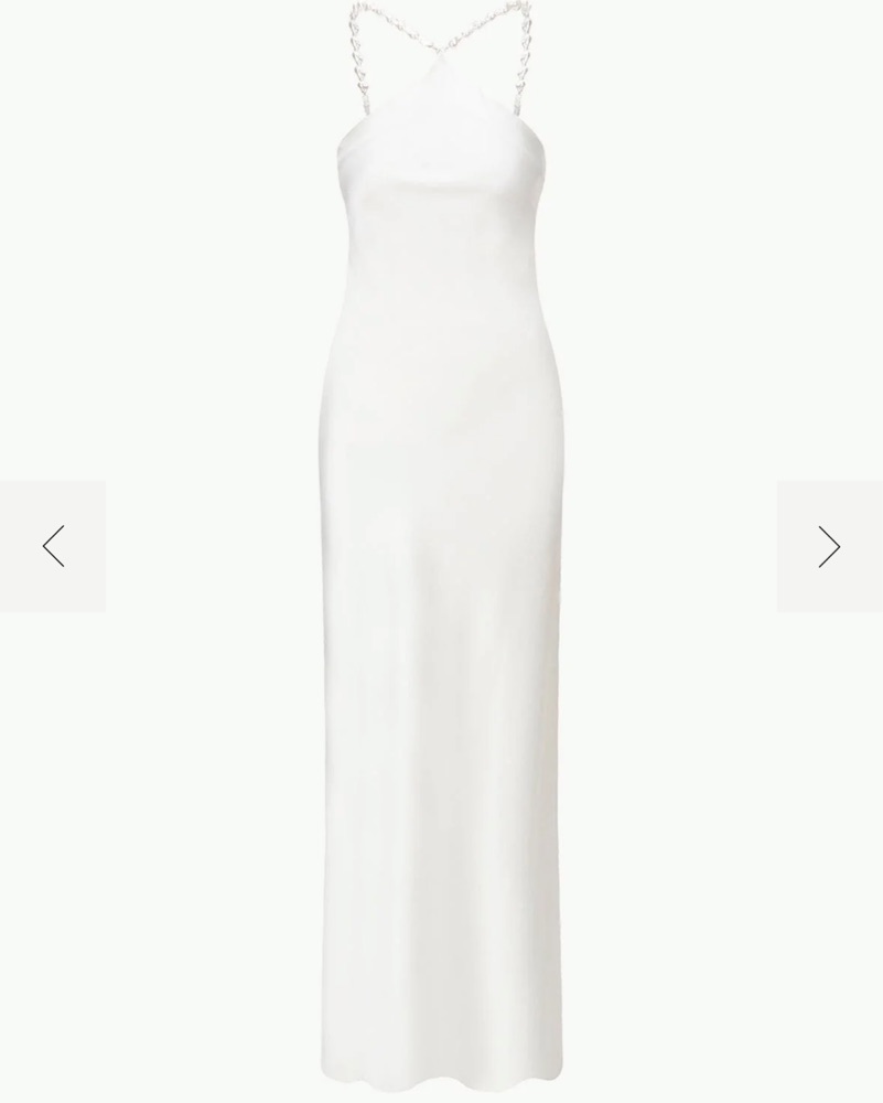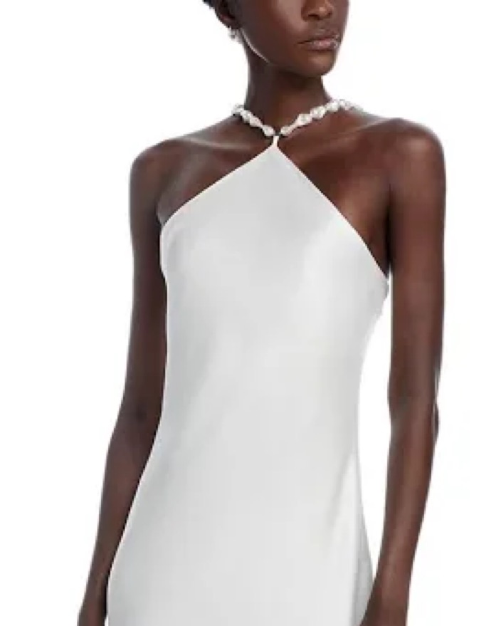 Perfect for any bridal event or engagement party. staud white dress with pearl looking beads as a halter. Super flattering!!