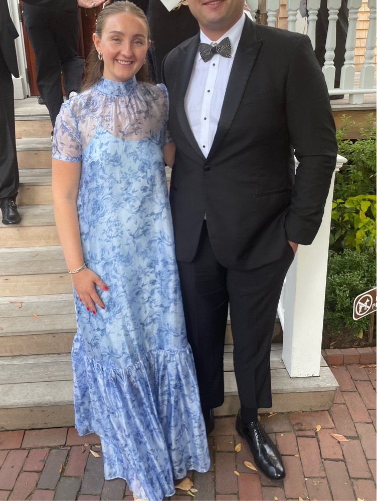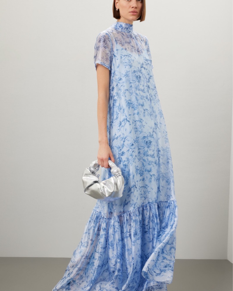 This beautiful floral maxi dress is perfect for a formal event or wedding guest attire. The airy, flowing silhouette and soft blue tones create a romantic, elegant look.