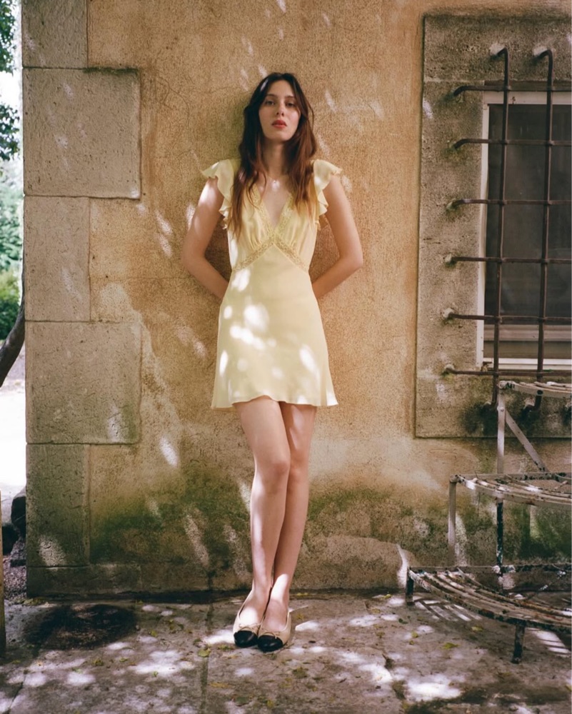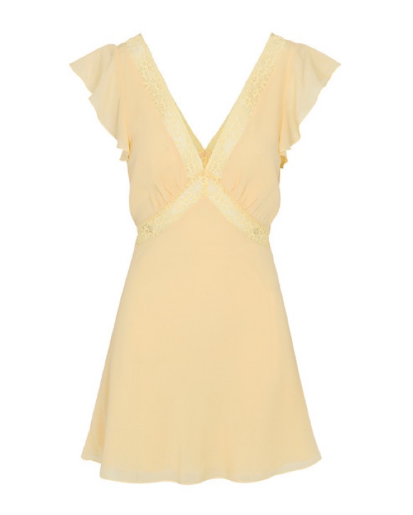 Yellow lace detail mini dress with flutter ruffle shoulders