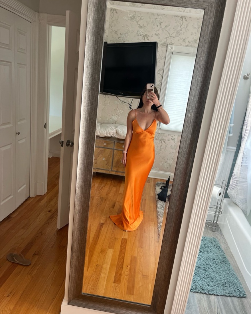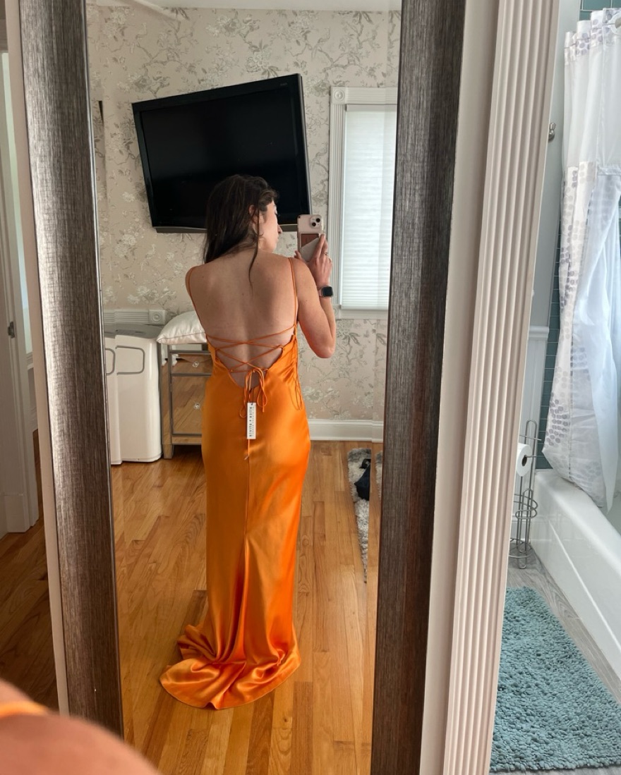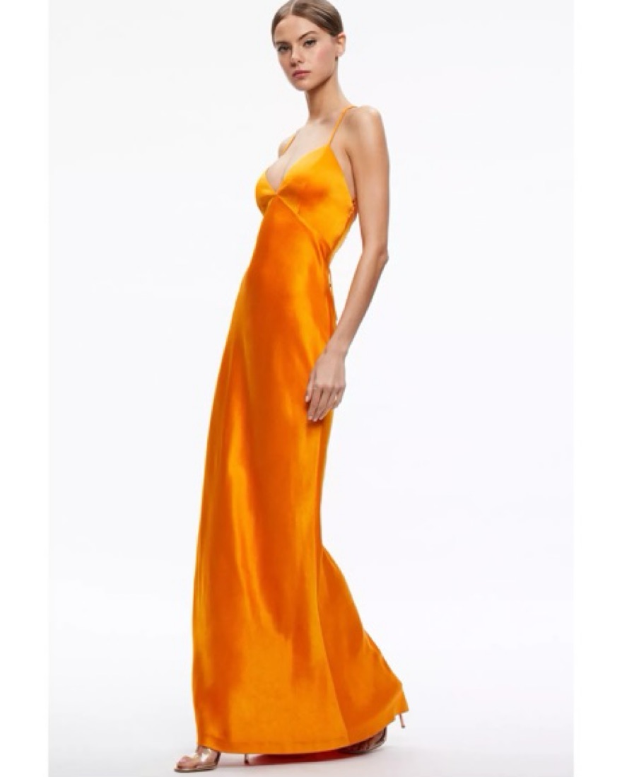 Alice + Olivia Montana Lace Up Back Maxi Gown. Length was tailored to fit 5’0 with 4-5 inch heels and touch the ground. Dry cleaned. Tangerine/Orange.