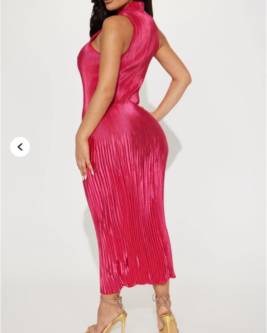 This striking pink pleated midi dress is perfect for a special occasion. The high neck and form-fitting silhouette create a flattering and elegant look.
