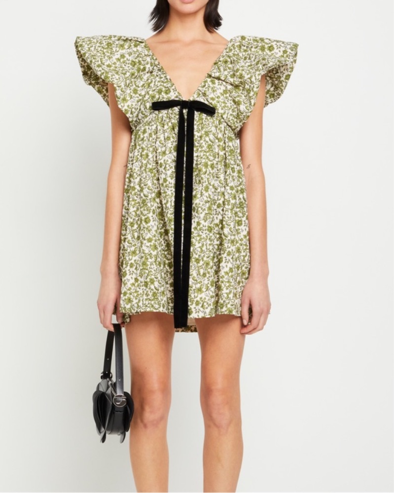 Green floral with black velvet tie! Agua Bendita dupe. hemmed 1 inch shorter to fit me - i am 5’ 4” - hemmed fit pictured in photos.